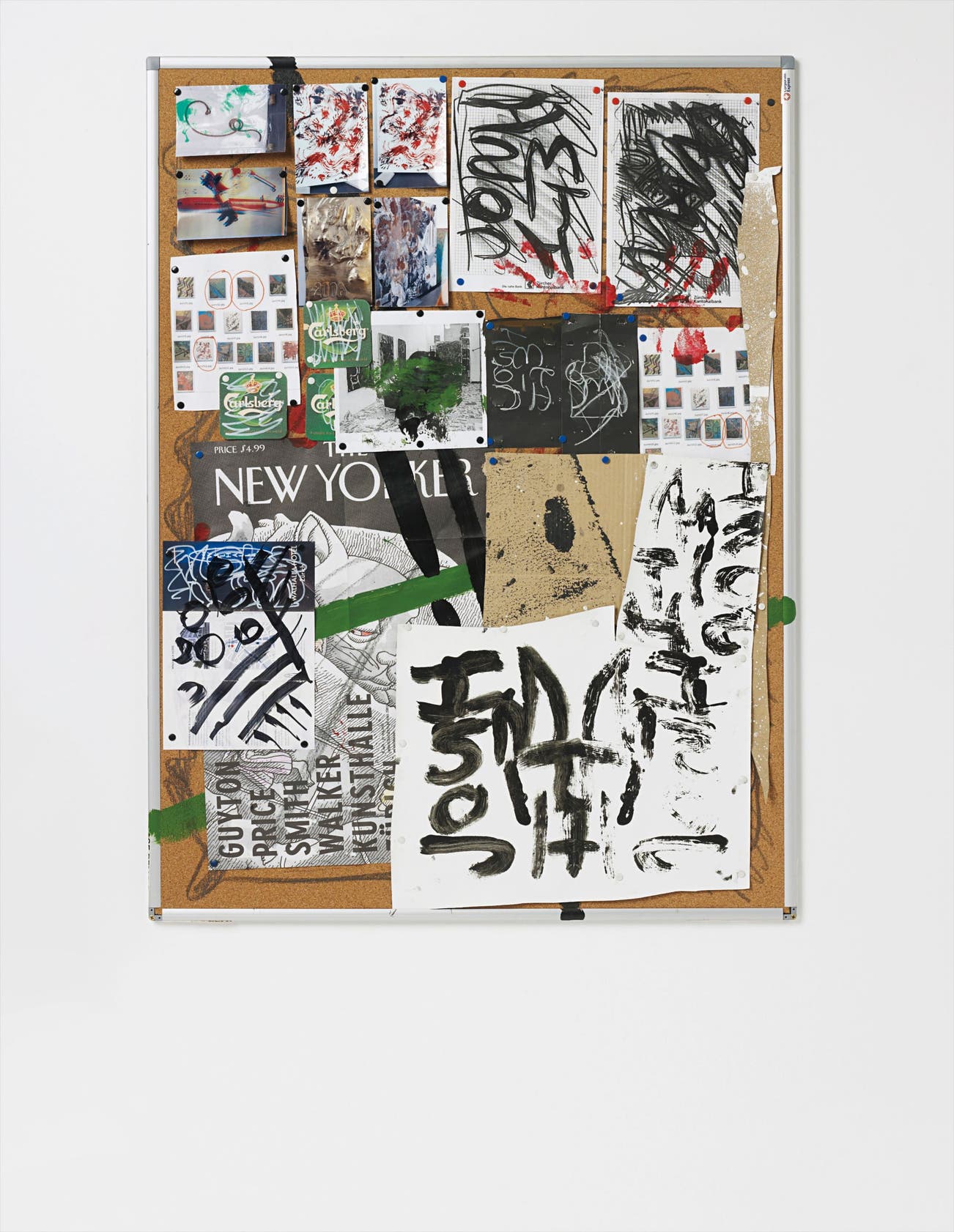 photographs, paper, card, oil, chalk, beer mats, pins on cork board