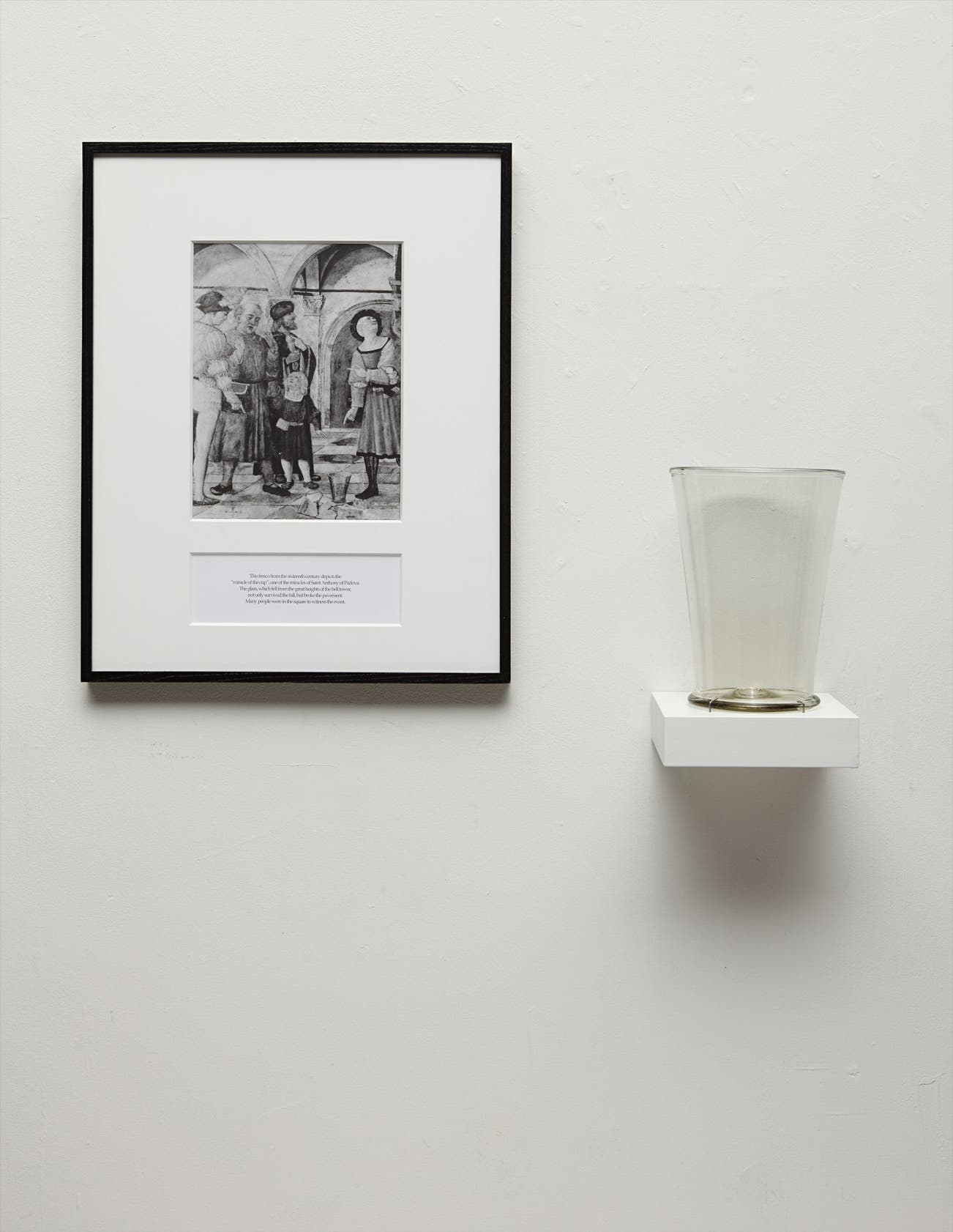 The complete set of three objects, one framed reproduction of a Renaissance fresco with text, one hand-blown glass vase and one painted shelf,