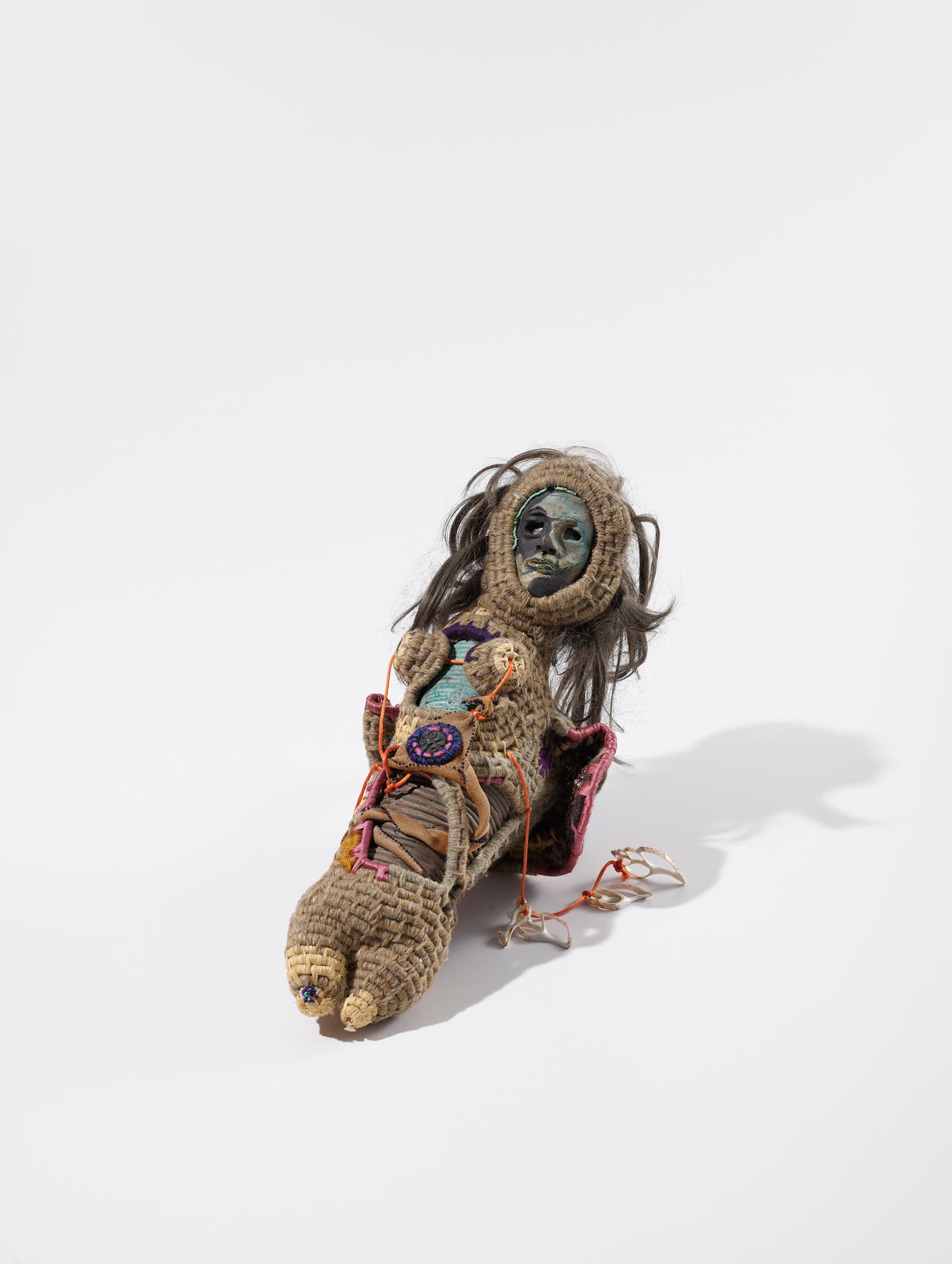 mixed media, beads, thread, raffia, yarn, hair, ceramics and shells