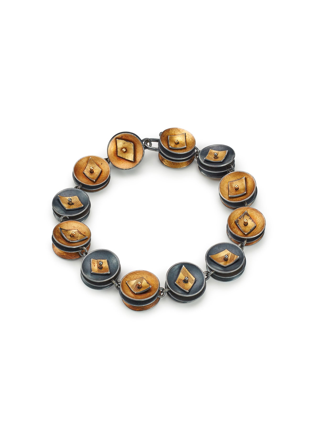 Oxidized sterling silver and 24 karat yellow gold, length approximately 7.75 inches