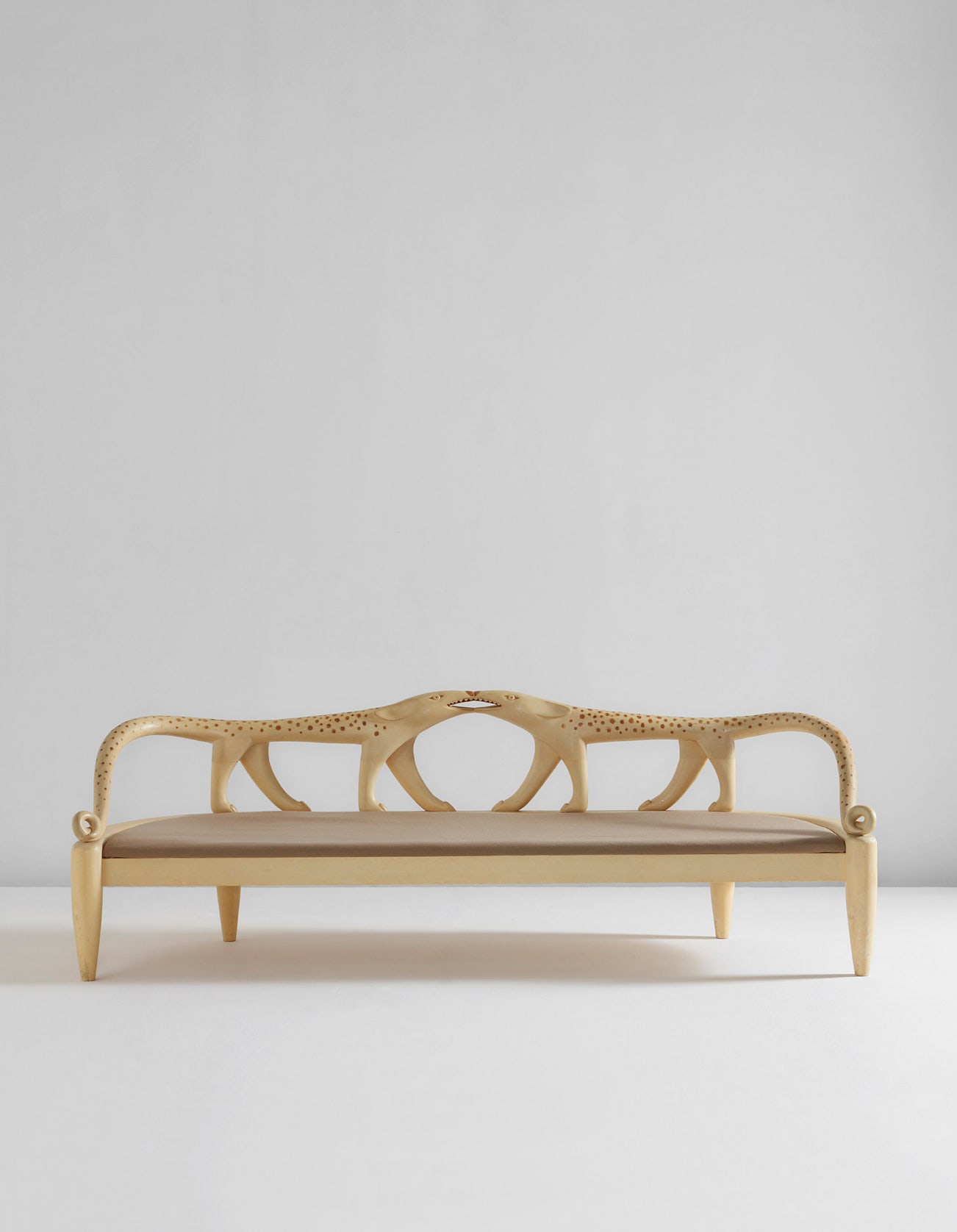 'Leopard Couch' (1983) ranks among McKie’s most compelling conceptions. It is a very early example of her signature style. She had begun exploring animal imagery just six years before, initially by adding shallow relief carvings to boxes and other simple forms. Much of her early inspiration came from artifacts she was seeing in museums, from Africa, India, and ancient Egypt, as well as Mesoamerican and Inuit cultures. These historic objects were ‘made primarily to be useful', she remarked, 'but also made with a certain kind of care—they had a preciousness, something very special about them’ (Joy Cattanach Smith, ‘Judy Kensley McKie’, American Craft , no. 43/6, Dec. 1983/Jan. 1984, p. 2). Increasingly, she achieved this ineffable quality in her own work. In 1979 she had her first professional breakthrough when she was included in the exhibition ‘New Handmade Furniture’, curated by Paul Smith for the American Craft Museum (now the Museum of Arts and Design) (Paul Smith, New American Furniture: American Furniture Makers Working in Hardwood, New York, 1979). This show positioned her alongside other prominent makers of the time, including Wendell Castle, and featured some of her initial forays into sculpting in‐the‐round.