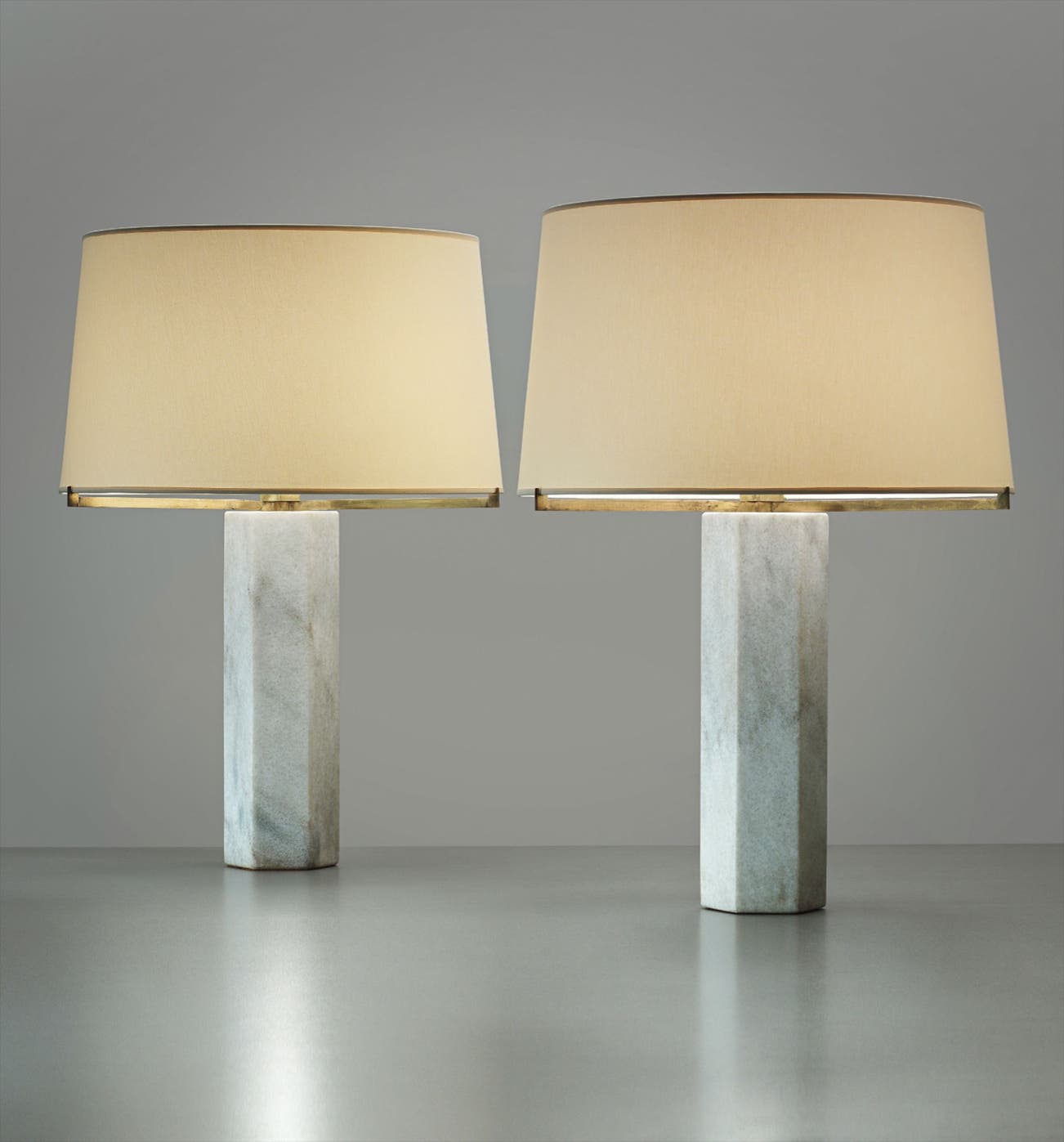 marble, brass, fabric shades.