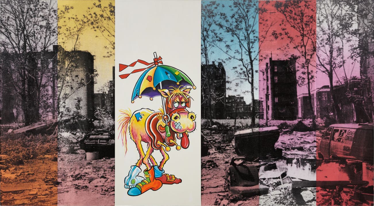 Landscape No. 13 (backyard) from 1990 encapsulates Julia Wachtel’s subversive use of appropriated imagery as a form of social commentary in a singular image. Throughout her prolific career over the past few decades, Wachtel has established herself as a master in the utilization of paradoxical subject matter to instigate an emotional reaction. The present lot belongs to the artist’s series of Landscape paintings, begun in the 1980s, all of which feature newsworthy political imagery interwoven with cartoon caricatures from pop culture. In Landscape No. 13 (backyard), Wachtel breaks the canvas into six distinct, vertical sections. Five of these outer sections illustrate a destructive political scene, wrought with rundown buildings in a nameless wasteland. In stark juxtaposition, the sixth section located in the inside part of the composition features a cartoon donkey with an umbrella atop his head, adorned with a whimsical expression of crossed eyes, a lazy tongue and turned out feet with mismatched shoes. Despite the dark imagery sandwiched around this playful figure, the composition retains a sense of joyfulness. The monochromatic image of destruction is itself washed over with a gradient of neons, while the donkey stands starkly against a bright white background. As such, Wachtel subversively suggests the similarity of these two types of imagery—real world news and imaginary cartoons. Despite the very different messages portrayed by each in the media, the artist reminds the viewer that both come from the same source, whether television or newspaper. As she explained of the series, “I see the cartoon characters as witnesses reflecting the existential condition of exposure to the global reality of horror and deprivation that exists somewhere on earth all the time. Whether it’s famine, civil war, genocide, etc., we are exposed to these realities and updated continuously in real time” (Julia Wachtel, quoted in “Julia Wachtel on Kimye and the Champagne Life”, Whitewall, March 14, 2014, online). In today’s day and age, Wachtel’s themes of technology and its power as illustrated in art feel all the more poignant. With her inclusion in the Whitney Museum of American Art’s present show, Fast Forward: Painting from the 1980s, as well as in recent shows at the Bergen Kunsthall and Walker Art Center in 2014 and 2016, Wachtel’s oeuvre is celebrated for its timeless relevance.