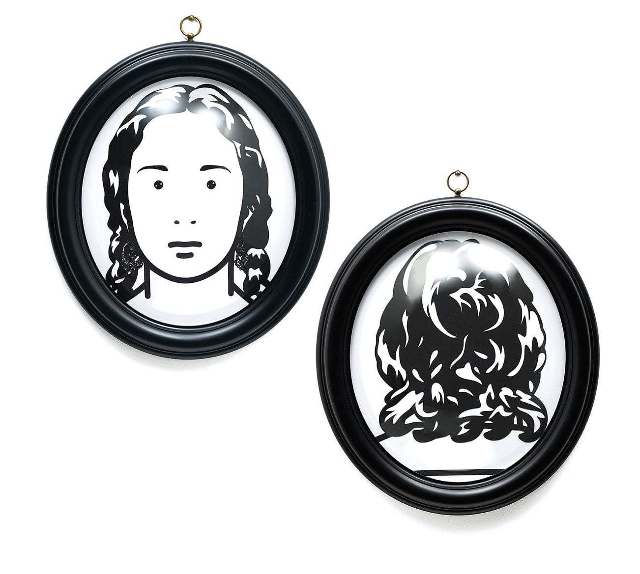 The pair of laser-cut Somerset Velvet black paper silhouettes, dry-mounted onto Clairefontaine Mayo paper (as issued), the full sheets.