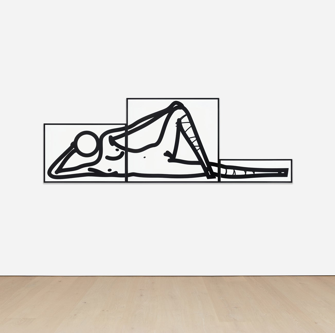 Flocking adhesive screenprinted on 3mm white Plexiglas acrylic, with hand-flocked black nylon, in three panels.