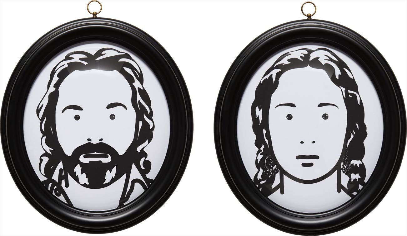 The complete pair of laser-cut black Somerset paper silhouette portraits, on Clairefontaine Mayo paper, contained in separate oval frames designed by the artist,