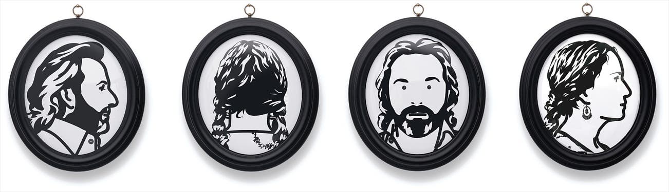 Two pairs of laser-cut Somerset Velvet black paper silhouettes, dry-mounted onto Clairefontaine Mayo white paper (as issued), the full sheets,