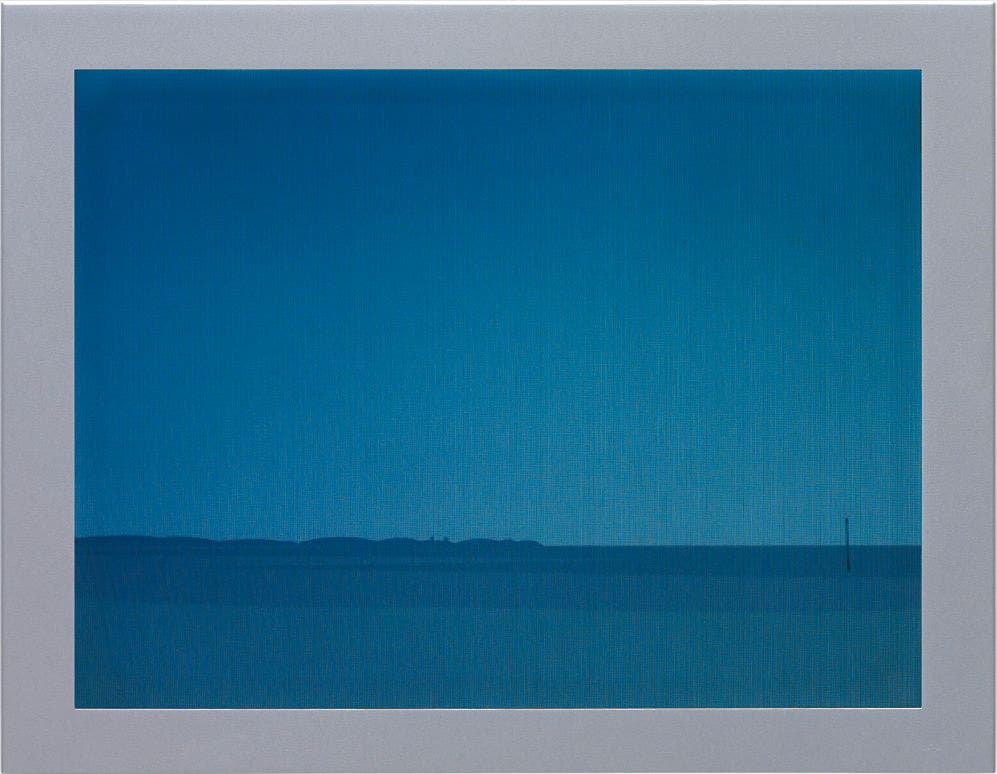 LCD animation presented as a continuous computer animation on a 48 second loop, with memory card supplied, programmed and fitted in LCD screen, contained in a custom made, black powder-coated metal surround,