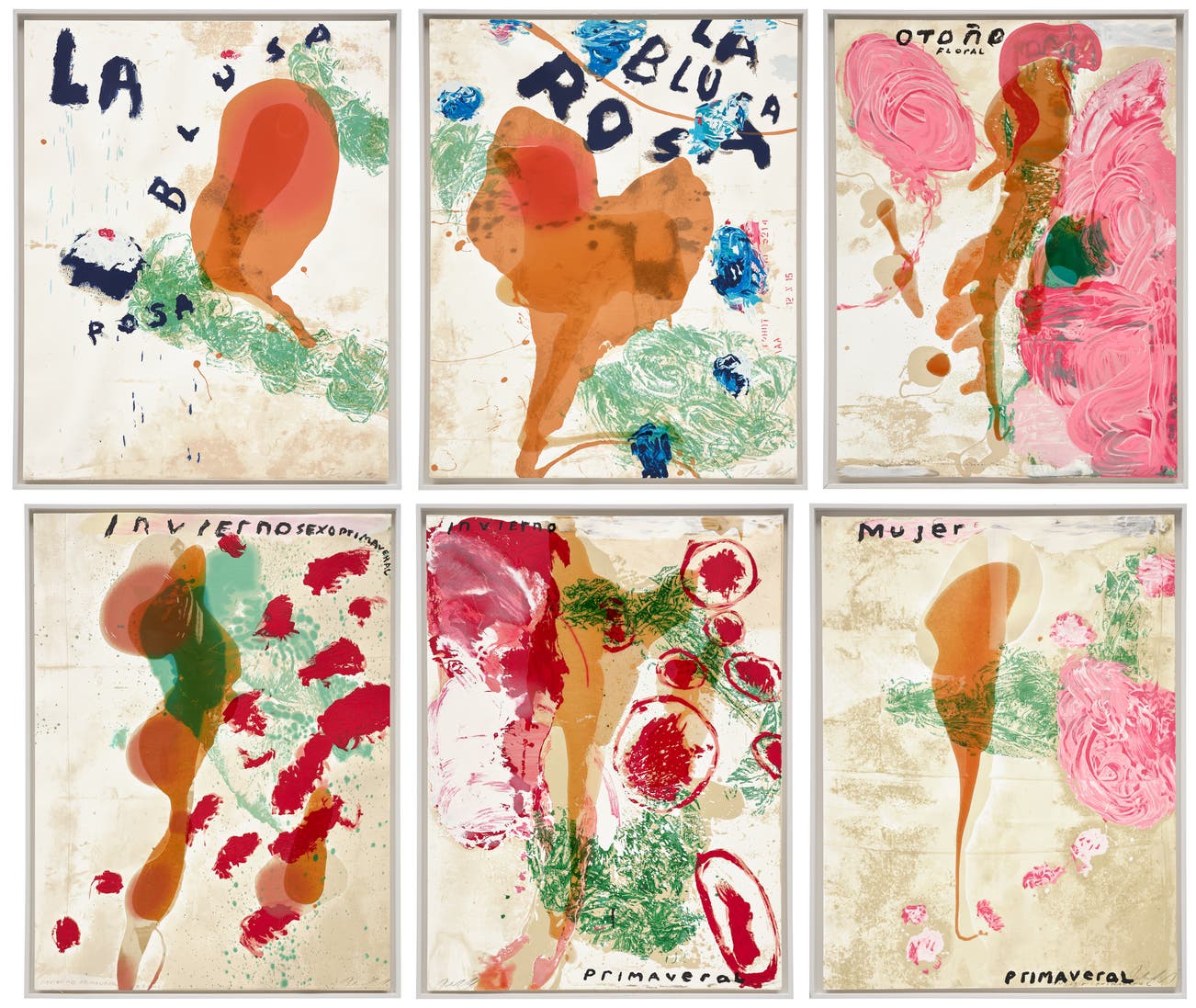 The complete set of six hand-colored screenprints with poured resin, on Rising Museum Board, the full sheets.