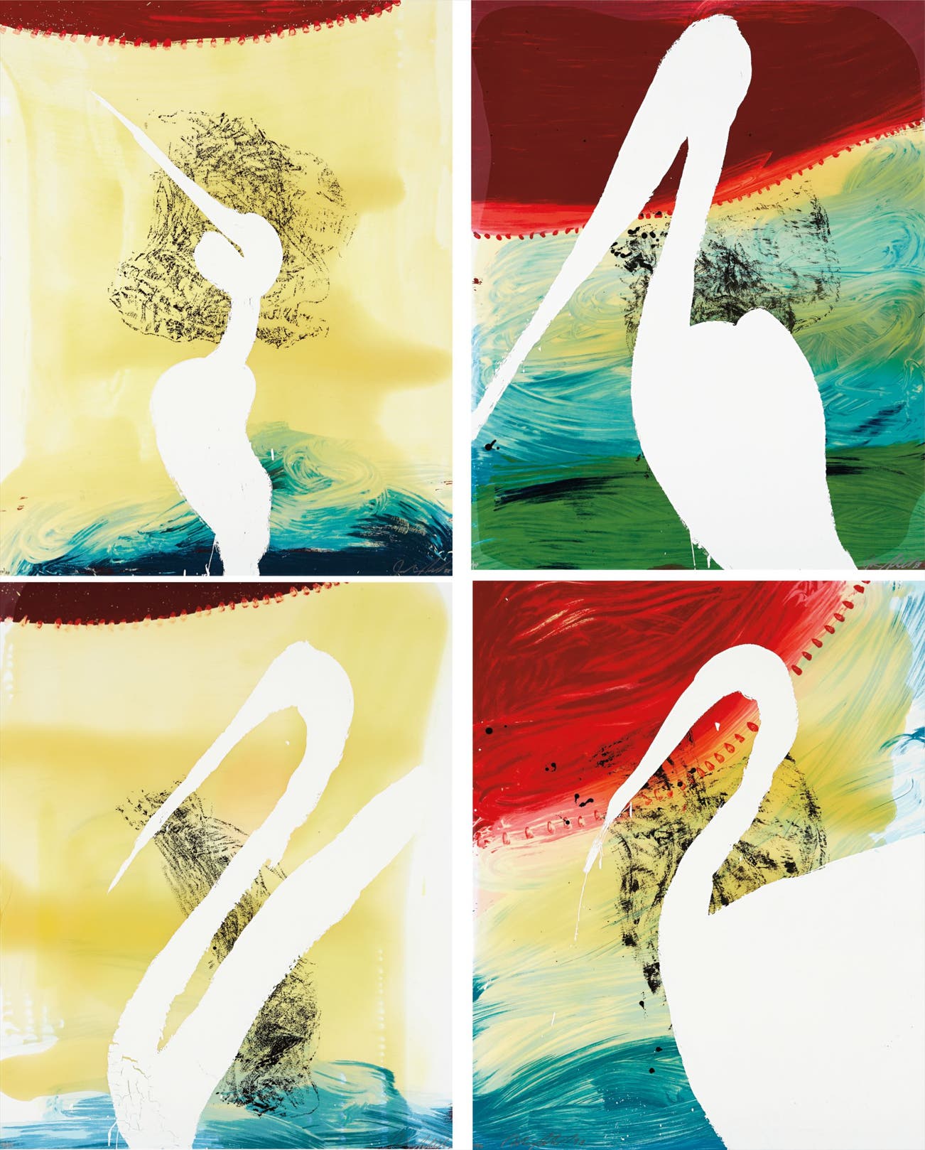 Four screenprints in colors with poured resin and hand-coloring, on Museum Board, the full sheets,