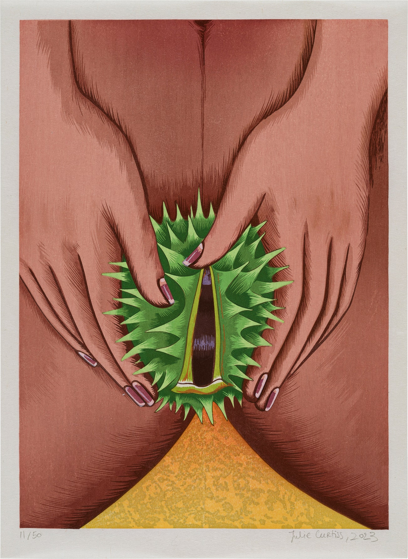 The artist draws on a history of figurative painting including 18th- and 19th-century French painting, as well as the Chicago Imagists and the ‘pop’ imagery of comic books, manga and illustration. Frequent subject matter focuses on the deconstructed female body and symbols of stereotypical female aesthetics. There are similarities between Curtiss’ work and the painters of the female Surrealist movement of the early 20th century in the use of distorted perspectives, dreamscapes, and humor to reflect upon the female experience.