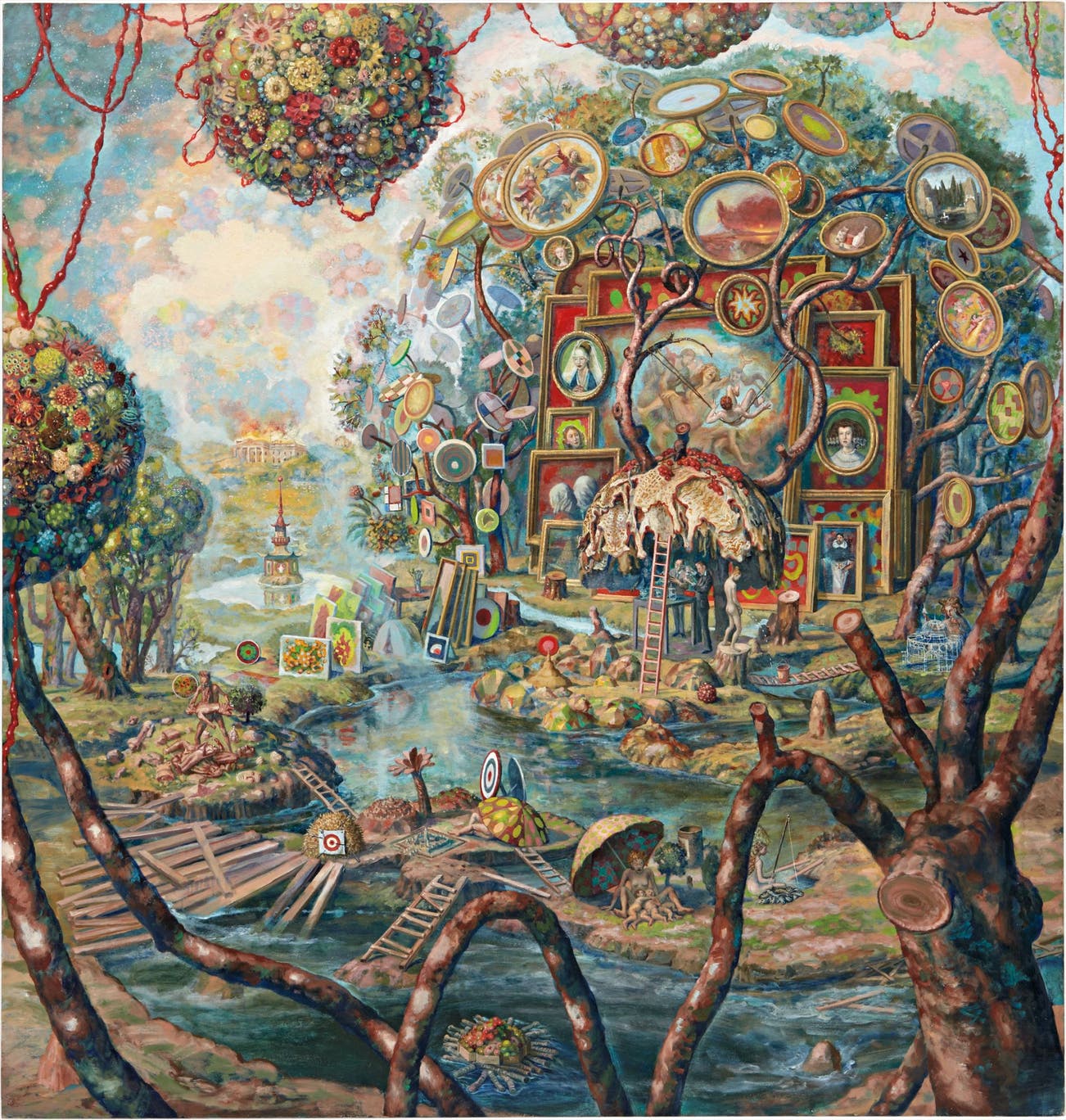 Signed, titled and dated "J. Heffernan ©2010, Self-Portrait Setting Up Camp" on the reverse; further inscribed "SP as Post Apocalyptic Planner" on left turning edge, and "Animal Shelter" on right turning edge.