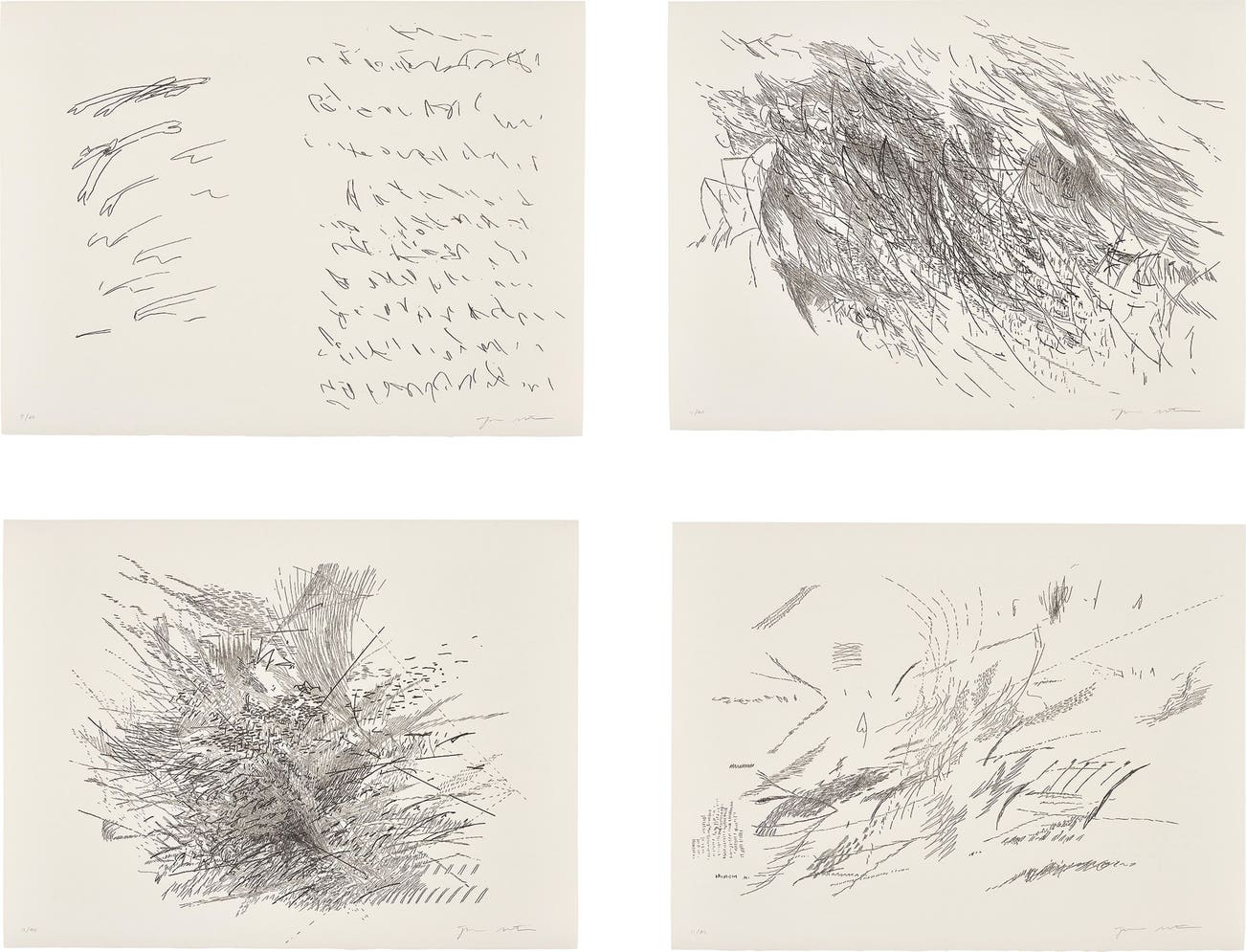 The complete set of four relief prints from letterpress plates, on Italian mould-made Revere paper, with full margins, with colophon, and original dark green portfolio.