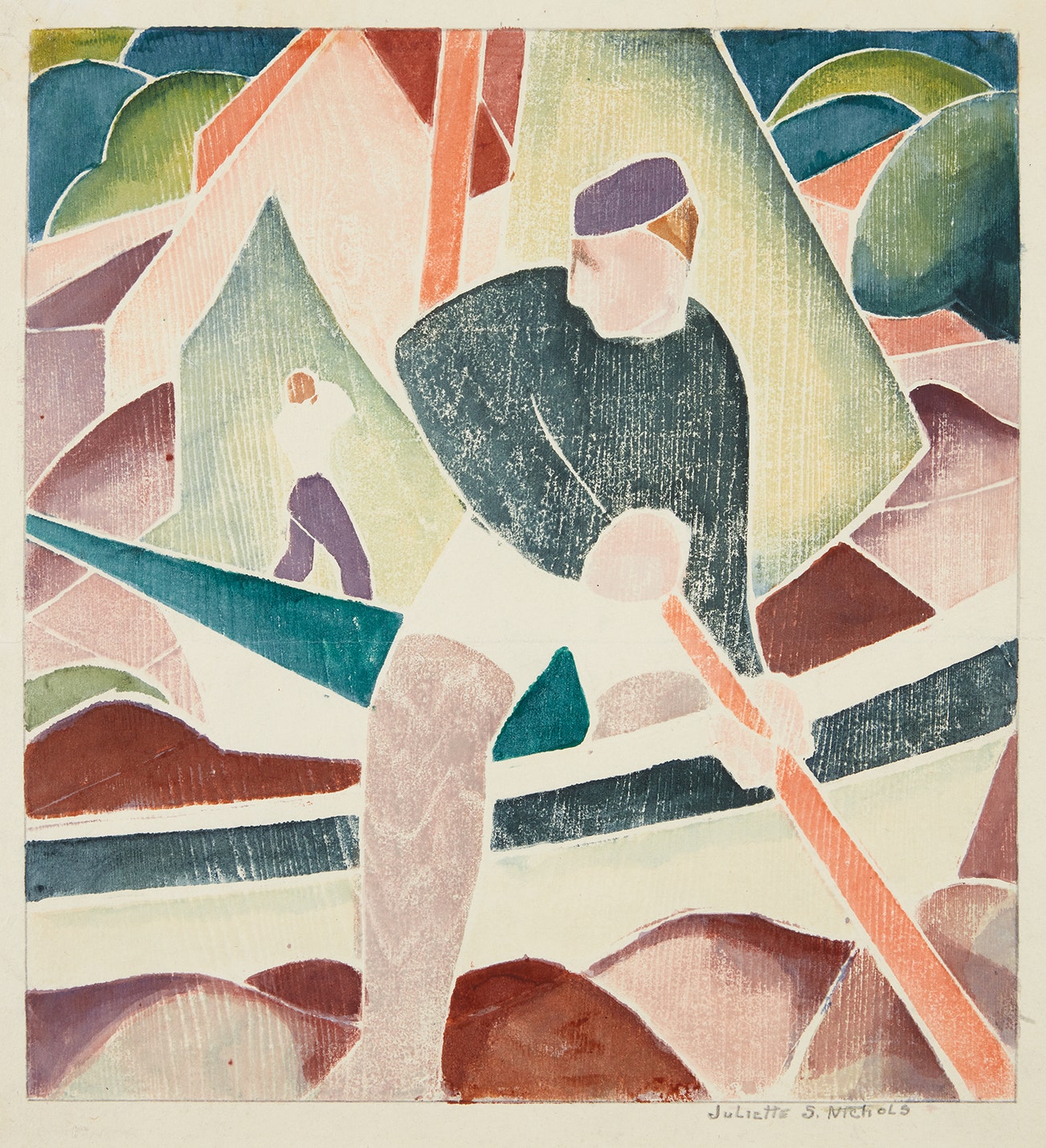 White-line woodcut in colors with hand-coloring, on wove paper, with margins.