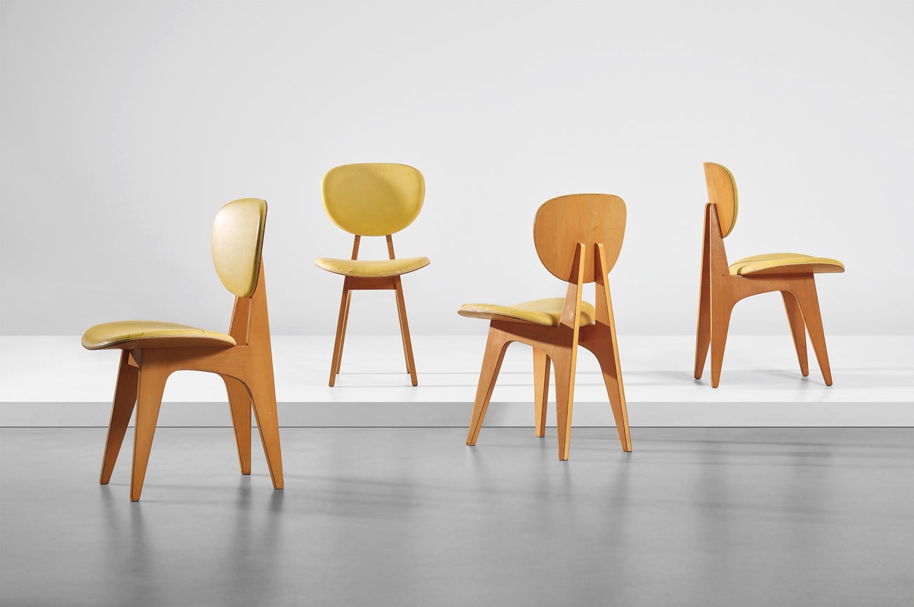 Manufactured by Tendō Mokkō, Tendō, Japan. Underside of three chairs with manufacturer's paper label printed TENDO MOKKO CO., LTD./MADE IN JAPAN and one chair with manufacturer's paper label.