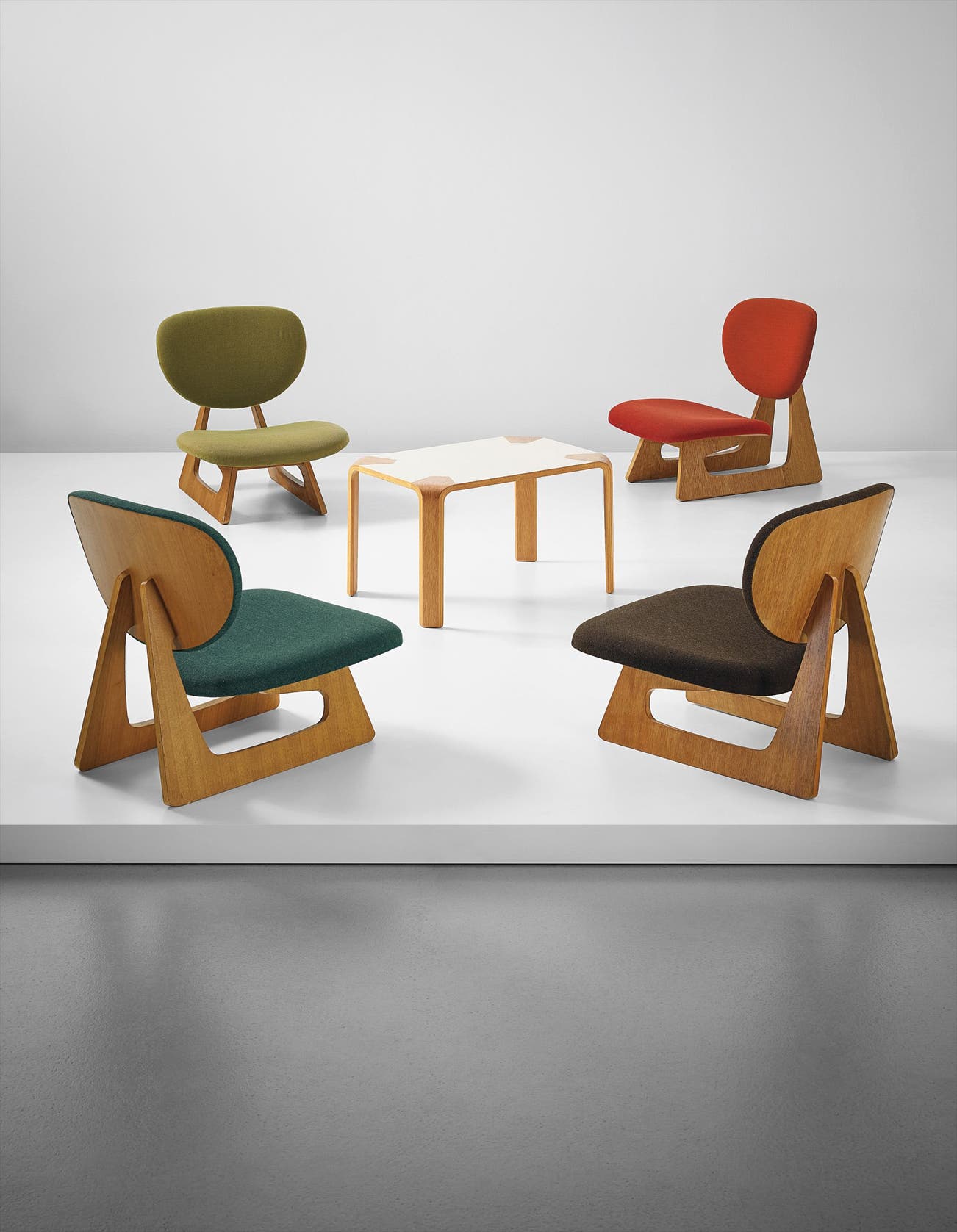 Each chair: Teak laminated plywood, fabric.