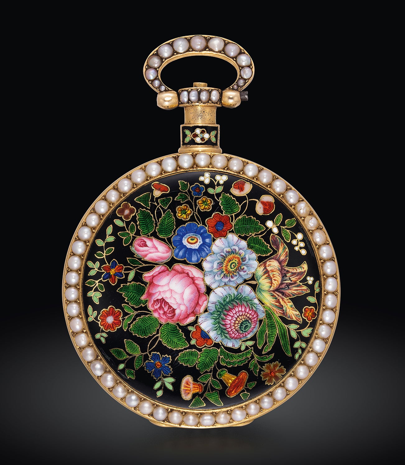 A very finely decorated and well-preserved yellow gold and pearl-set open faced pocket watch with Empire-styled case, champlevé and miniature enamel painting depicting bouquets de Chine, white enamel dial, engraved cuvette and movement and duplex escapement, made for the Chinese market