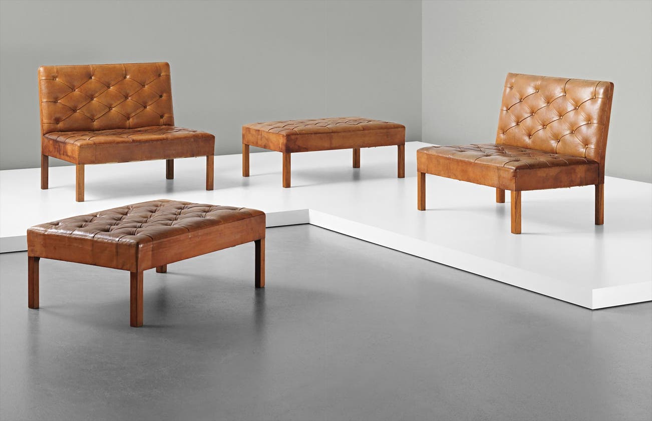 Executed by cabinetmakers Rud. Rasmussen A/S, Denmark. Underside of one stool with manufacturer’s paper label RUD. RASMUSSENS/SNEDKERIER/45 NØRREBROGADE/KØBENHAVN, pencilled serial number 25720 and architect's monogrammed paper label. Comprising pair of chairs and stools.