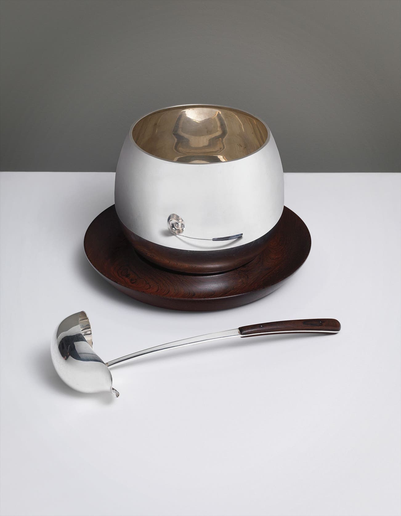 Produced by Kay Bojesen, Denmark. Underside of plate with paper label KAY BOJESENS SØLVSMEDIE KONGELIG HOFLEVERANDØR, underside of bowl marked 925S, maker's mark, DENMARK and ladle marked 925S, maker's mark, and KBS.