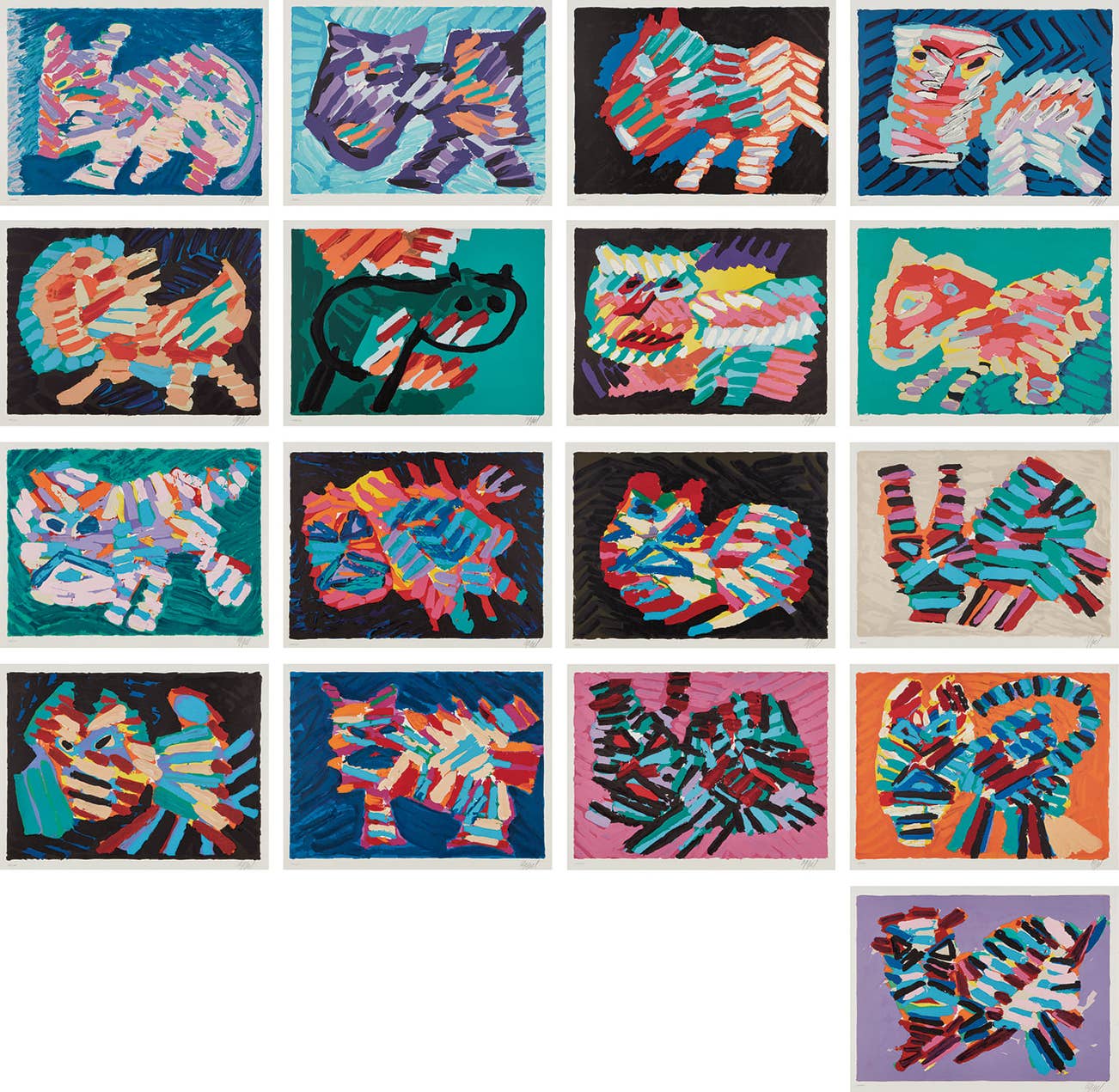 Including: Resting Cat; Walking Cat; Cat in the Night; Sad Cat; Green Cat; Pink Cat; Luminous Cat; Stalking Cat; Devil Cat; House Cat; Frightened Cat; Fighting Cat; Blue Cat; About a Cat; Innocent Cat; and Sunshine Cat
