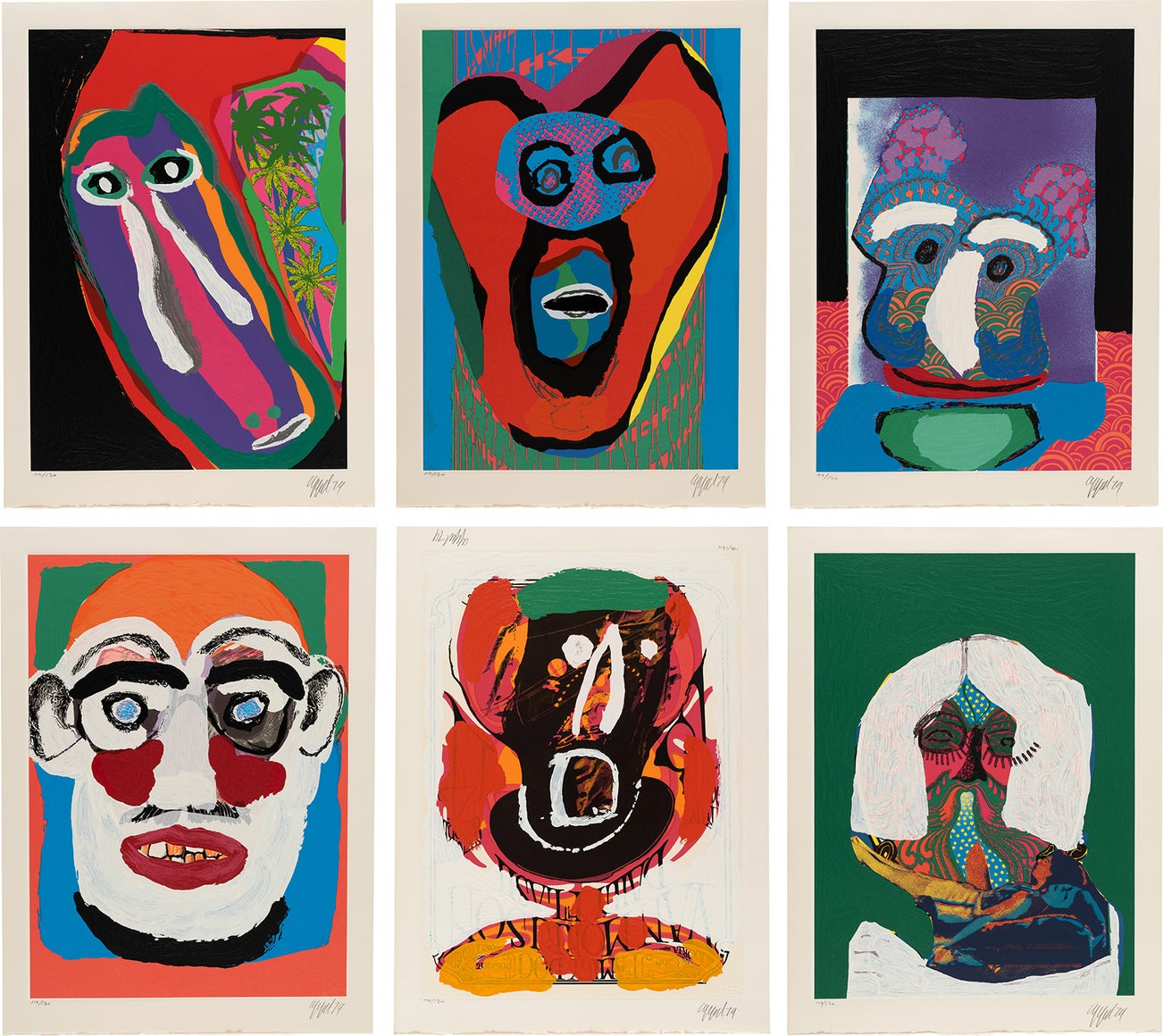 The complete set of six mixed media prints in colors with embossing, on Arches paper, with full margins, with title page, all contained in the original blue fabric-covered portfolio.