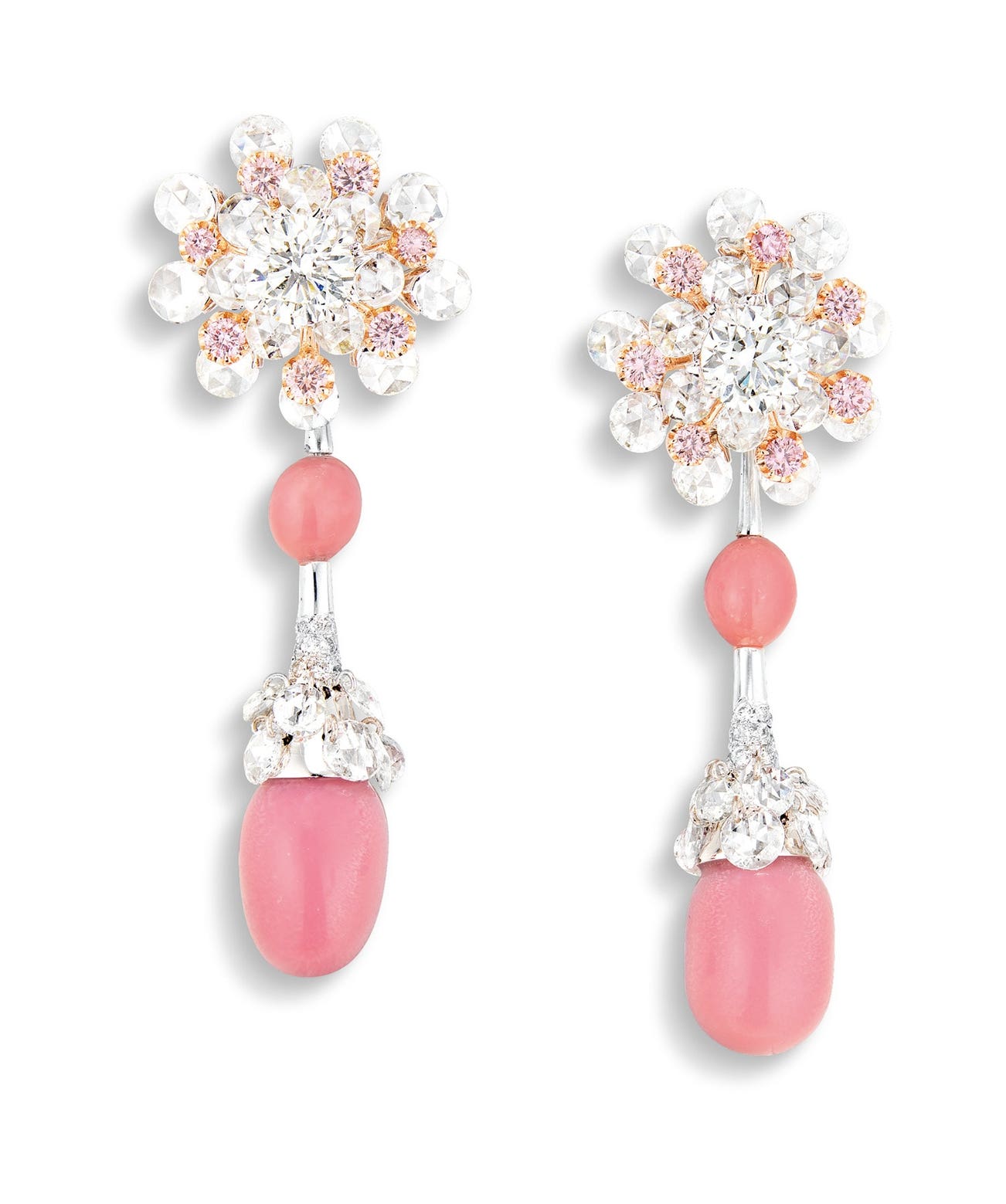 Each suspending two ovoid-shaped conch pearls, totalling approximately 10.05 carats; decorated with rose-cut diamondsSurmount set with rose- and brilliant-cut diamonds, highlighted with pink diamonds18 karat white and pink gold(Two Larger Conch Pearls) <em>GIA report, numbered 2354312852, dated 5 May 2020, natural saltwater pearls, no indications of treatment. </em><em>Ear-pendants detachable </em>