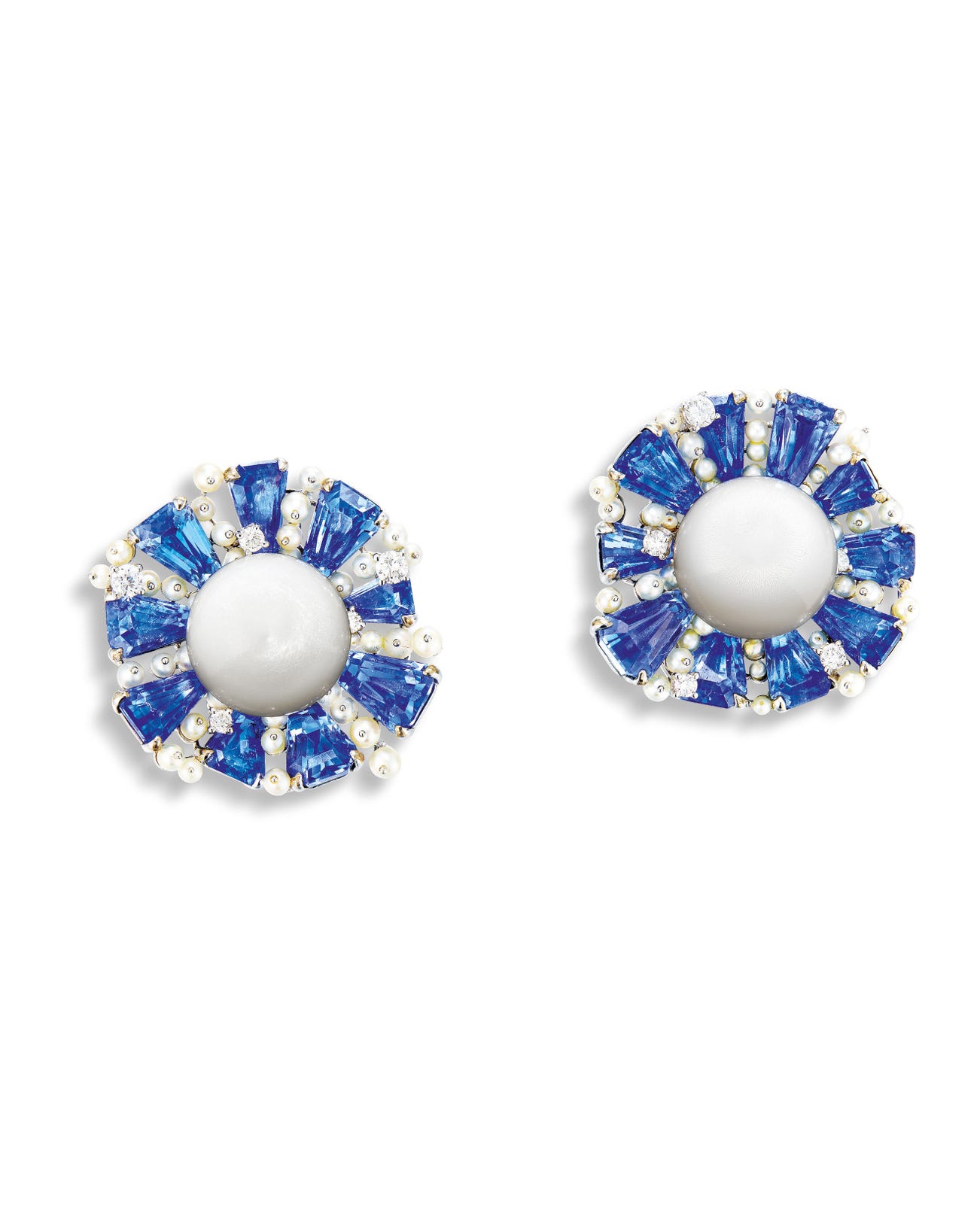 Each centring on a button-shaped clam pearl, <em>diameter measuring approximately 13.65mm and 13.60mm respectively </em>Surrounded by tapered sapphires, seed pearls and brilliant-cut diamonds18 karat white gold(Clam Pearls)