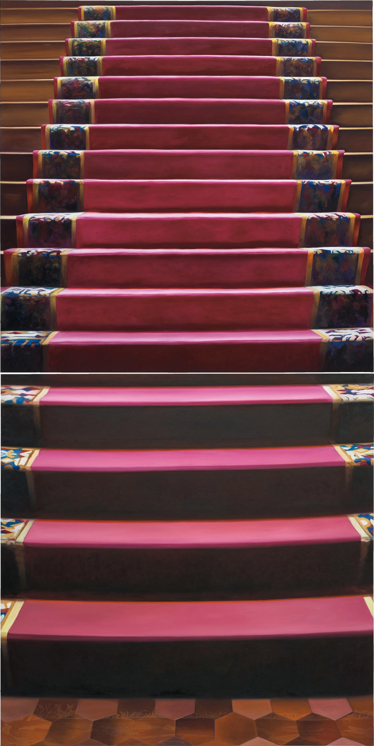 In the present work, shades of deep red with blue and yellow arabesque runners appear timeless. The rich colours and ornamentation exude a sense of lavishness and perhaps suggest associations with petit bourgeois taste. As Kneffel explains, ‘a certain sense of melancholy and anxiety […] No one likes these kinds of furnishings. They are largely disregarded in intellectual circles, just as the classically modern Bauhaus furnishings are unanimously indisputable’ (the artist, quoted in Daniel J. Schreiber, ‘Looking Back to the Future’, Artist’s Website, online). In addition, the enormous scale of the painting distorts our perception as a quotidian flight of carpeted stairs. We are immediately dwarfed by the huge swathes of red paint, appearing abstract to the viewer until seen from a distance. It is through this ingenious interplay between reality and illusion that Kneffel absorbs us into her uncanny world.