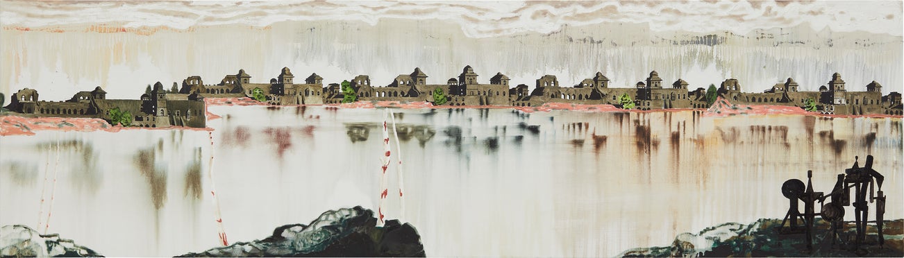 Featured at the 50th Venice Biennale in 2003, The Blank Memories Always Open From the South, 2002, is one of Karin Mamma Andersson’s largest and most accomplished panoramic landscape paintings. Summoning a commanding presence, the over nine-foot wide canvas presents the vista of an ostensibly Delft or Scandinavian shore, punctuated by a line of ancient buildings. Setting the foundation for her celebrated painting Heimat Land, 2004, the present work marked the breakthrough moment in the painter’s career that preceded her award of the prestigious Carnegie Art Award three years later. A cornerstone work in Andersson’s œuvre, The Blank Memories Always Open From the South was included in the artist’s solo exhibition at the Moderna Museet, Stockholm in 2007 that traveled to the Kunsthalle, Helsinki, and the Camden Arts Centre, London.