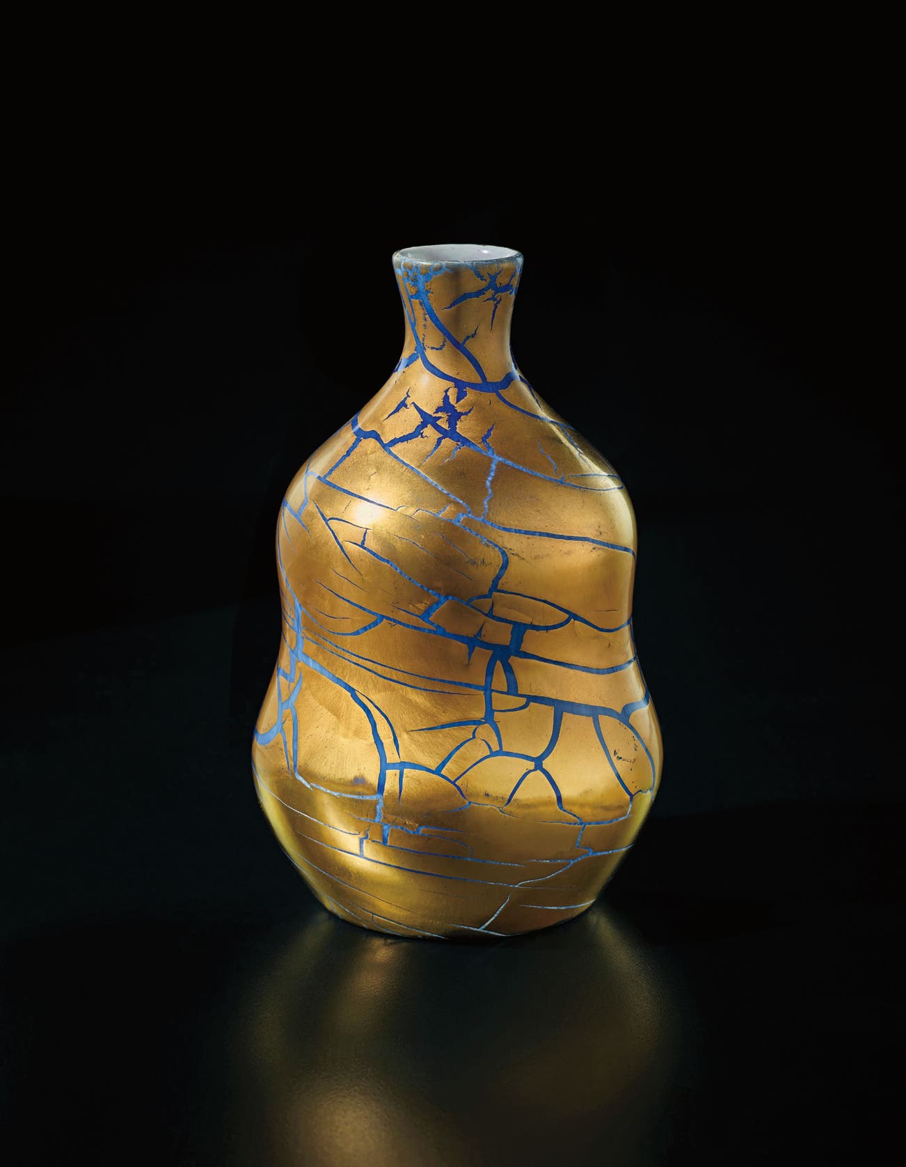 Thrown from fine clay and glazed with sapphire blue luster and 24 karat gold leaf, the vase is groundbreaking in its modern expression and illustrates the transformation of pottery from a utilitarian object to a work of fine art.