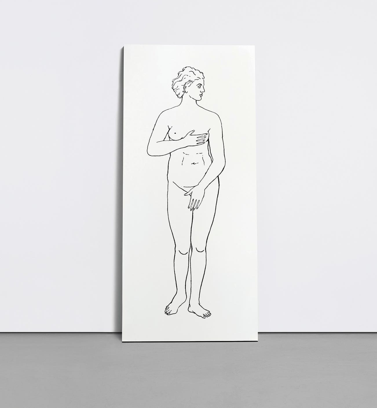 "The theme of Katharina Fritsch's artistic work is questioning the reality of objects, commodities, and motifs which we can perceive every day and which are simultaneously subjected to a collective code of identification. In her encyclopedic drawings (Lecikonzeichnungen, from 1996 on), Fritsch has been investigating about the reproduction and its tradition. These lexical images exist as part of our standard or collective memory, transformed by the artist into meta drawings by isolation, magnification, and framing ... It becomes evident that the images depicted in these two door panels are not just those of human beings, of man as such, merely they reflect the ideological and educational background of their origin."