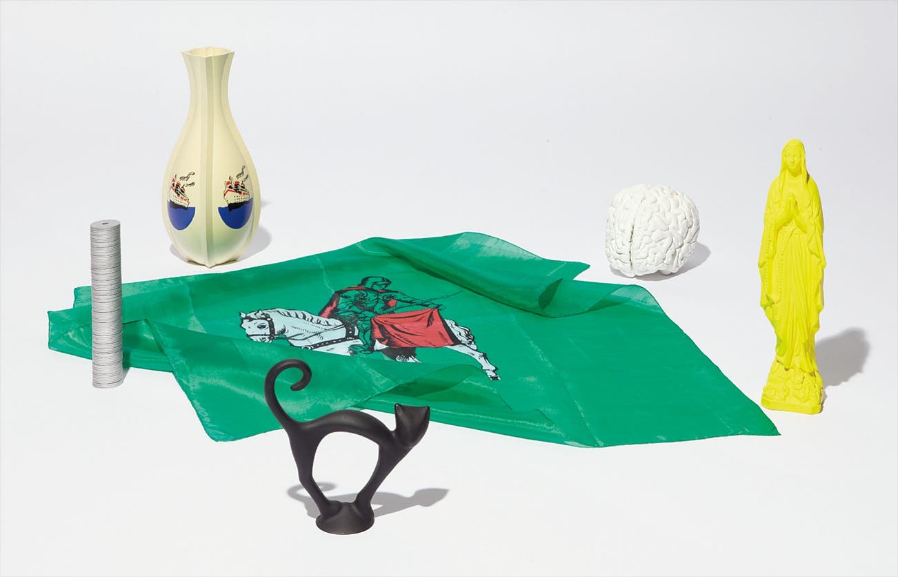 The complete set of six multiples in various media, including plaster, plastic, metal and screenprint on silk,