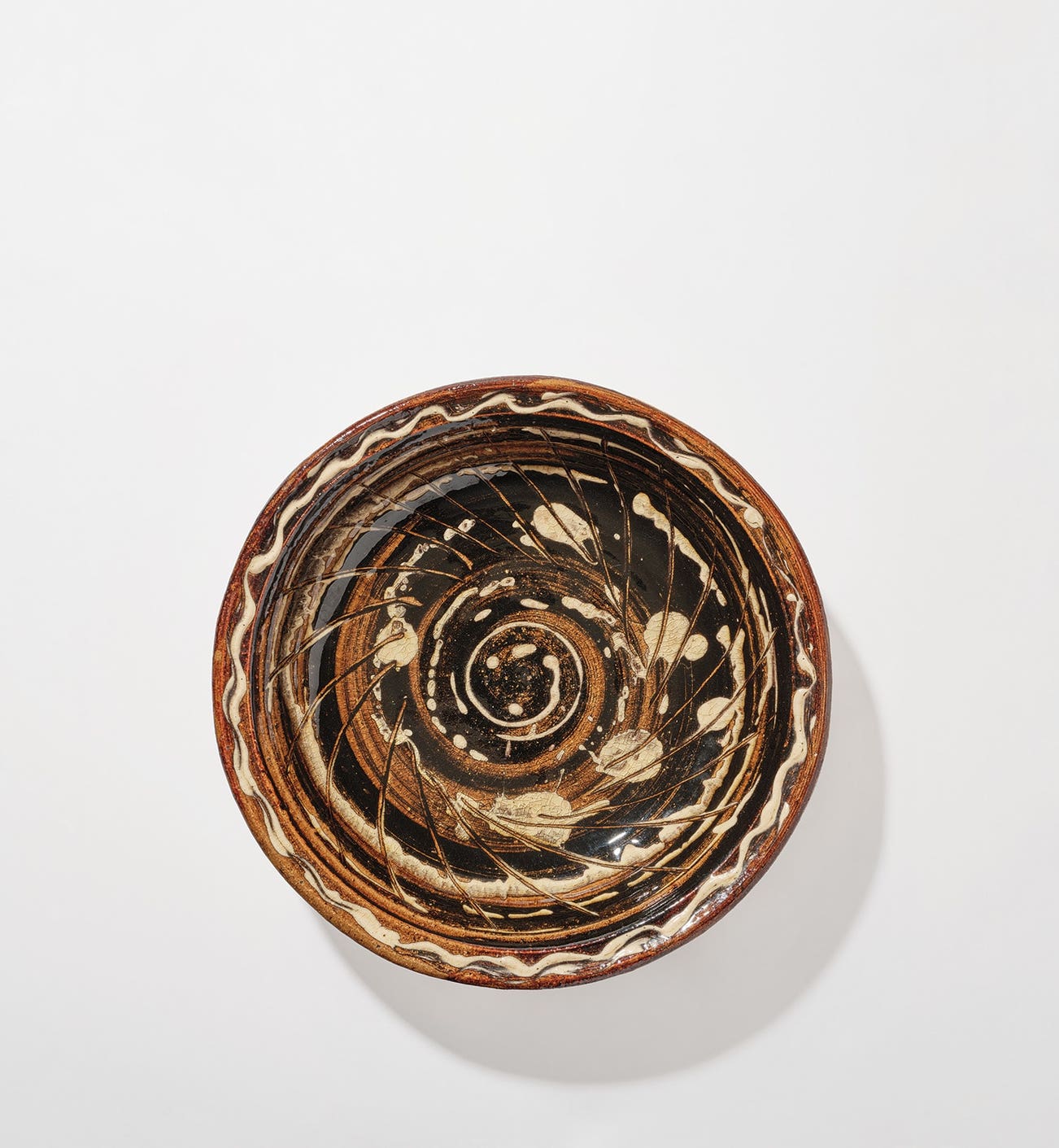 Stoneware, brown ash glazes with cream trailed slip and incised spiralling designs, the underside unglazed with combed design.
