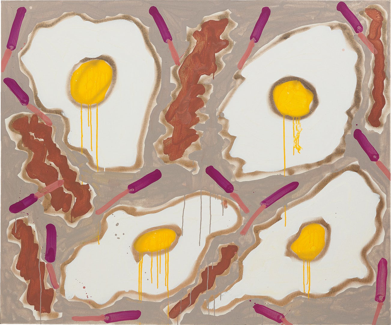 American | 1975Katherine Bernhardt, whether in her paintings or make-shift Moroccan rugs, is rapt by neons and geometries. The artist, who works in New York, takes an almost hasty-flick of a brushstroke that lands as a jagged architectural form — figures cut in space and in buzzing colors that leave a mental trace.