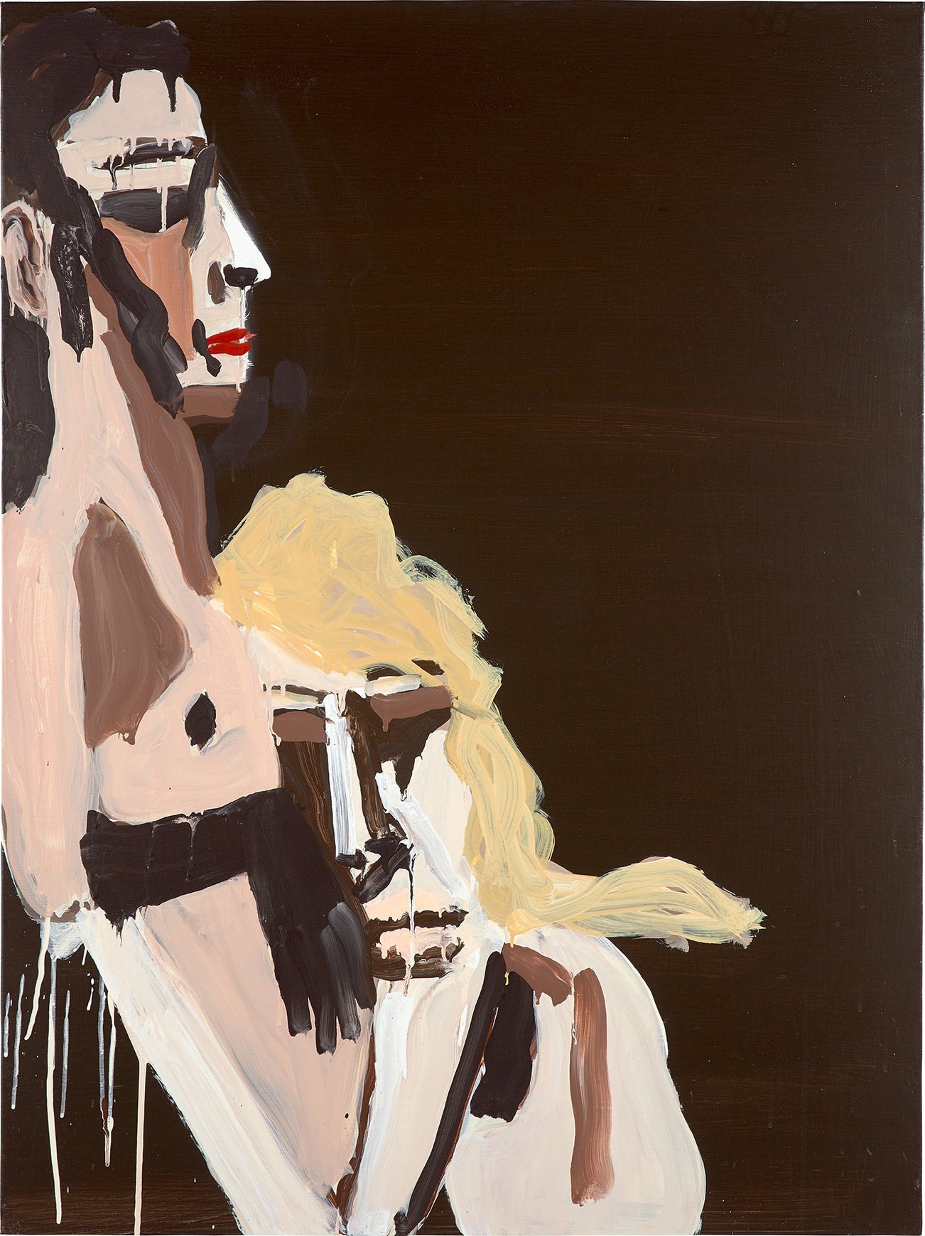 Seemingly each month, multiple galleries, museums or art fairs across the world exhibit Bernhardt's large-scale fantasies and rug-centric installations, as seen in 2017 at Art Basel and with a solo retrospective at the Modern Art Museum of Fort Worth, Fort Worth. "I think the best painters don't intellectualize their own art—they just make stuff," she says; but with sharks circling trash in the water in today's climate, as is depicted in Sharks, Toilet Paper and Plantains, it's not hard to see Bernhardt's deeper meanings.