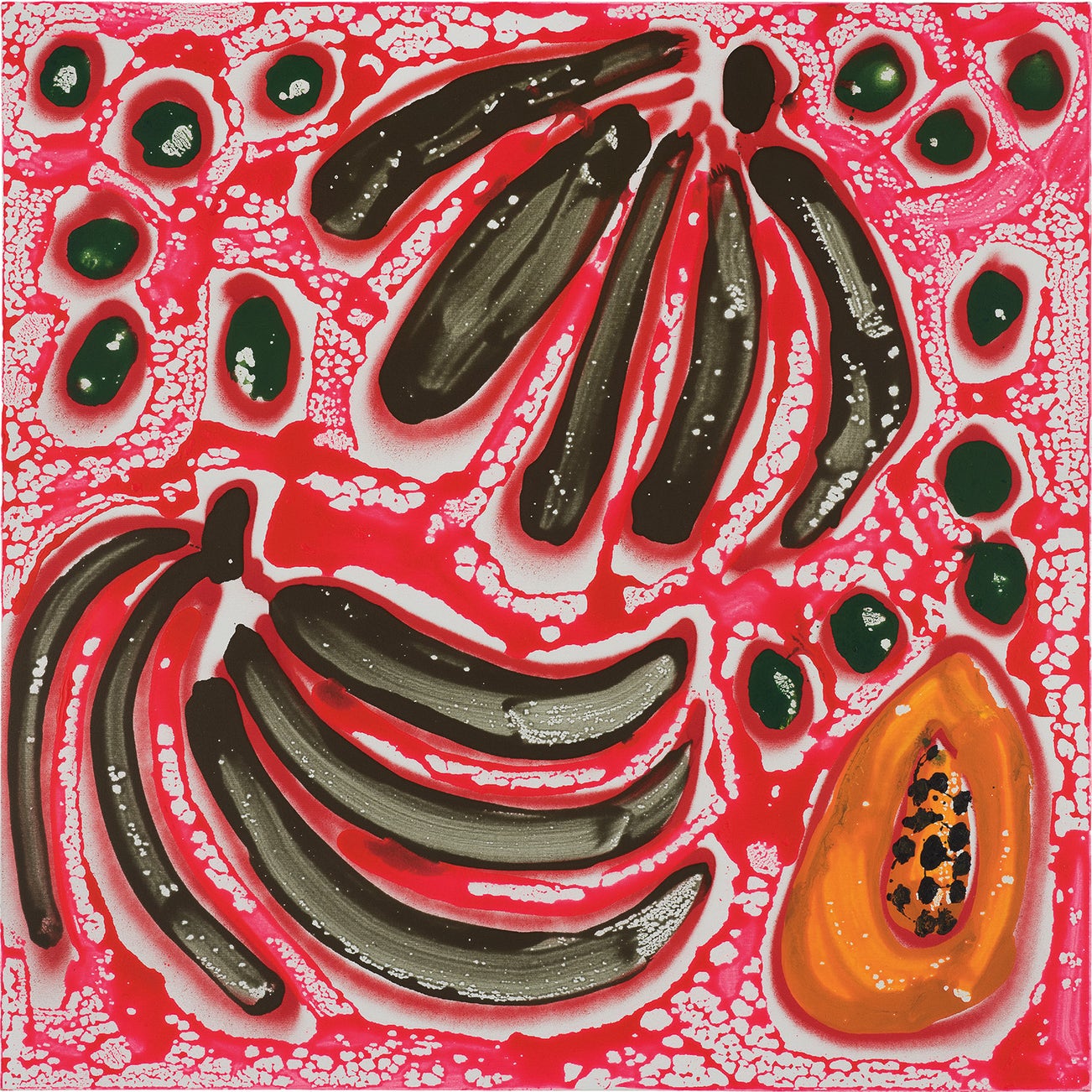 Seemingly each month, multiple galleries, museums or art fairs across the world exhibit Bernhardt's large-scale fantasies and rug-centric installations, as seen in 2017 at Art Basel and with a solo retrospective at the Modern Art Museum of Fort Worth, Fort Worth. "I think the best painters don't intellectualize their own art—they just make stuff," she says; but with sharks circling trash in the water in today's climate, as is depicted in Sharks, Toilet Paper and Plantains, it's not hard to see Bernhardt's deeper meanings.