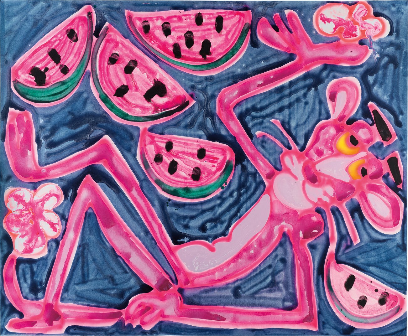 American | 1975Katherine Bernhardt, whether in her paintings or make-shift Moroccan rugs, is rapt by neons and geometries. The artist, who works in New York, takes an almost hasty-flick of a brushstroke that lands as a jagged architectural form — figures cut in space and in buzzing colors that leave a mental trace.