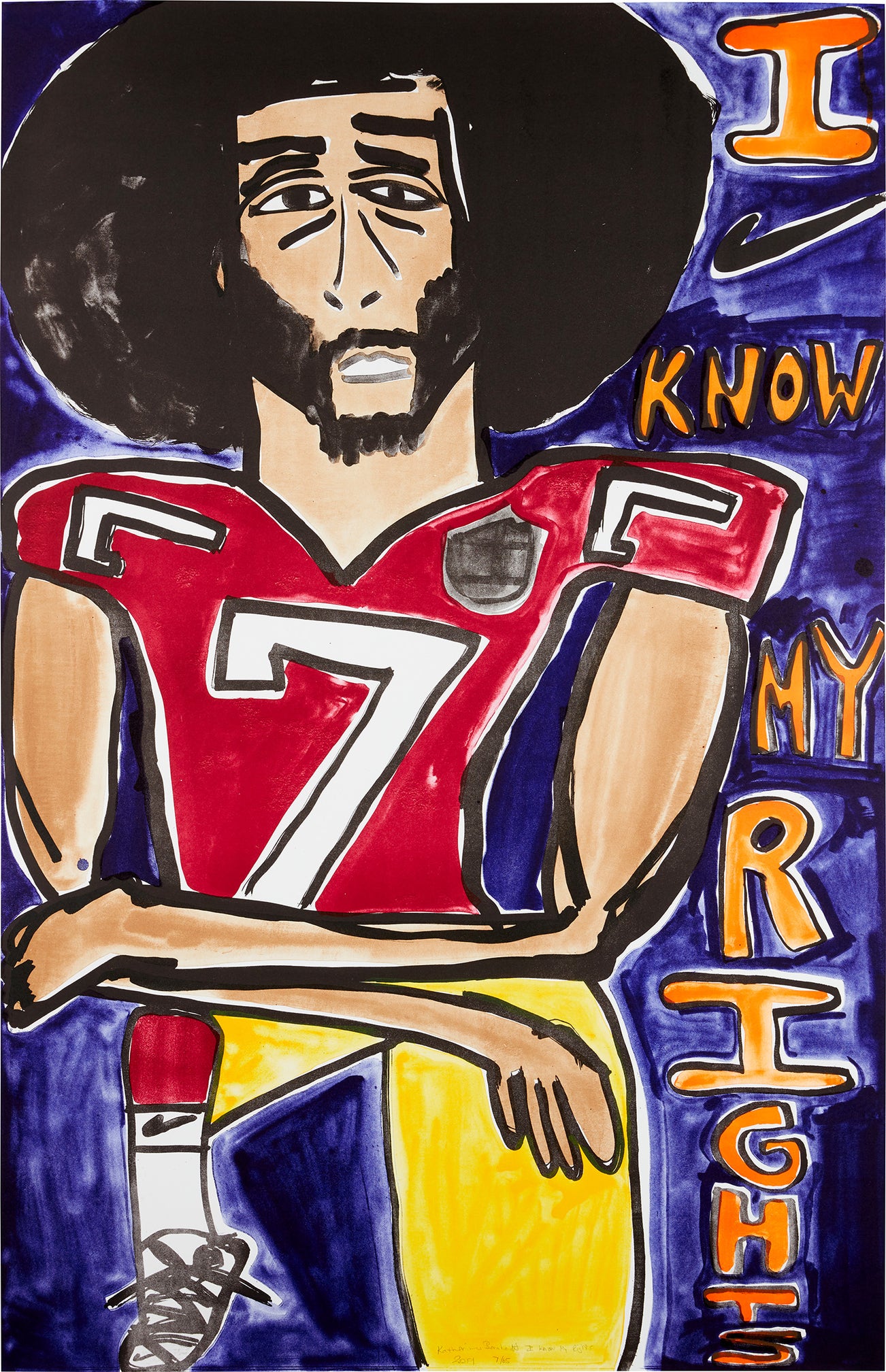 American | 1975Katherine Bernhardt, whether in her paintings or make-shift Moroccan rugs, is rapt by neons and geometries. The artist, who works in New York, takes an almost hasty-flick of a brushstroke that lands as a jagged architectural form — figures cut in space and in buzzing colors that leave a mental trace.