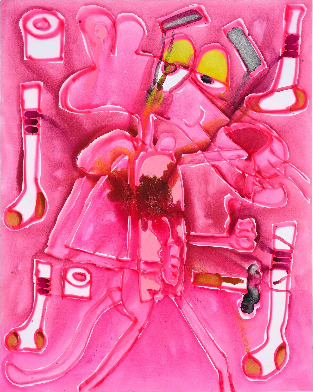 Seemingly each month, multiple galleries, museums or art fairs across the world exhibit Bernhardt's large-scale fantasies and rug-centric installations, as seen in 2017 at Art Basel and with a solo retrospective at the Modern Art Museum of Fort Worth, Fort Worth. "I think the best painters don't intellectualize their own art—they just make stuff," she says; but with sharks circling trash in the water in today's climate, as is depicted in Sharks, Toilet Paper and Plantains, it's not hard to see Bernhardt's deeper meanings.