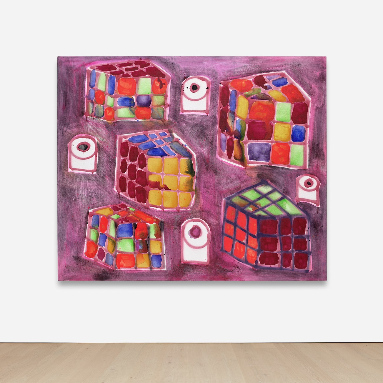 Seemingly each month, multiple galleries, museums or art fairs across the world exhibit Bernhardt's large-scale fantasies and rug-centric installations, as seen in 2017 at Art Basel and with a solo retrospective at the Modern Art Museum of Fort Worth, Fort Worth. "I think the best painters don't intellectualize their own art—they just make stuff," she says; but with sharks circling trash in the water in today's climate, as is depicted in Sharks, Toilet Paper and Plantains, it's not hard to see Bernhardt's deeper meanings.