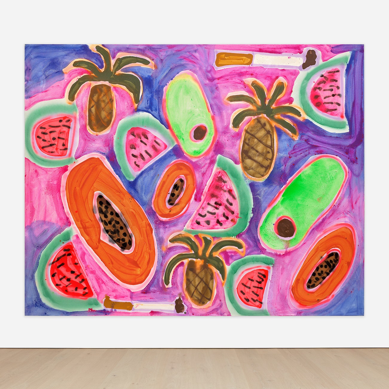 Seemingly each month, multiple galleries, museums or art fairs across the world exhibit Bernhardt's large-scale fantasies and rug-centric installations, as seen in 2017 at Art Basel and with a solo retrospective at the Modern Art Museum of Fort Worth, Fort Worth. "I think the best painters don't intellectualize their own art—they just make stuff," she says; but with sharks circling trash in the water in today's climate, as is depicted in Sharks, Toilet Paper and Plantains, it's not hard to see Bernhardt's deeper meanings.