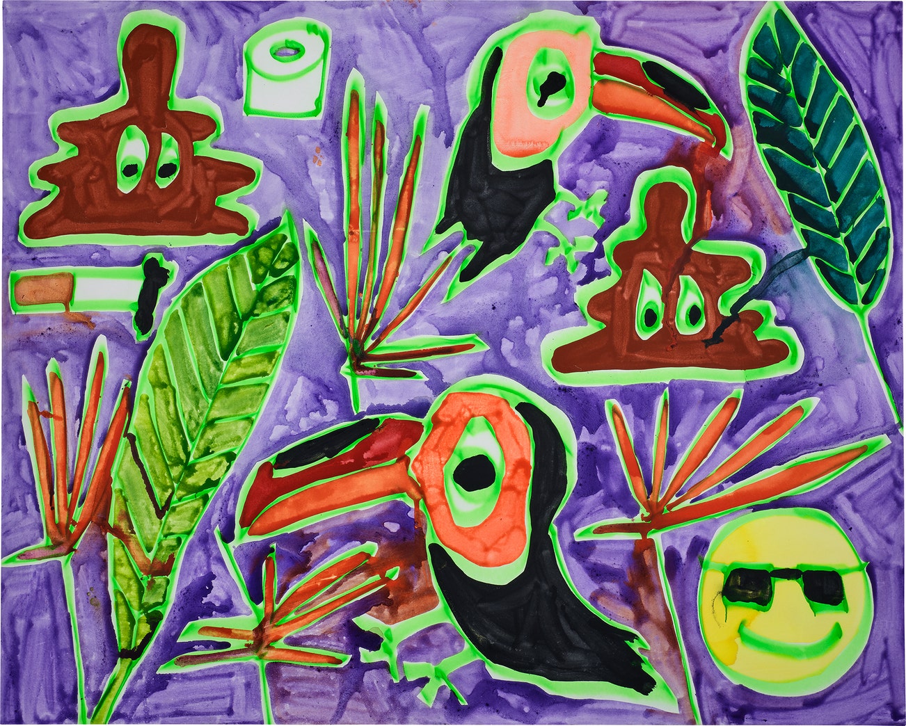 Seemingly each month, multiple galleries, museums or art fairs across the world exhibit Bernhardt's large-scale fantasies and rug-centric installations, as seen in 2017 at Art Basel and with a solo retrospective at the Modern Art Museum of Fort Worth, Fort Worth. "I think the best painters don't intellectualize their own art—they just make stuff," she says; but with sharks circling trash in the water in today's climate, as is depicted in Sharks, Toilet Paper and Plantains, it's not hard to see Bernhardt's deeper meanings.