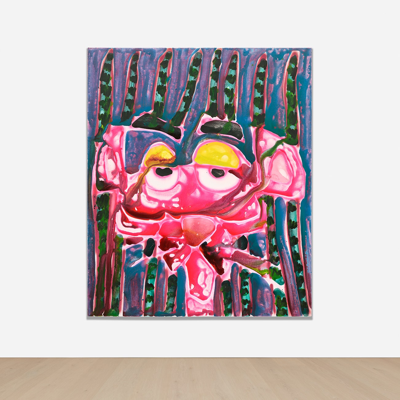 American | 1975Katherine Bernhardt, whether in her paintings or make-shift Moroccan rugs, is rapt by neons and geometries. The artist, who works in New York, takes an almost hasty-flick of a brushstroke that lands as a jagged architectural form — figures cut in space and in buzzing colors that leave a mental trace.