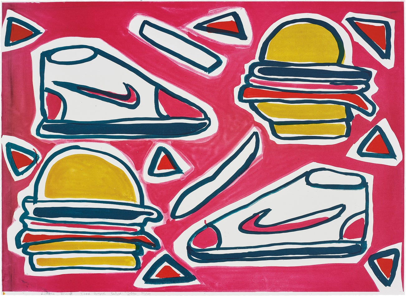 American | 1975Katherine Bernhardt, whether in her paintings or make-shift Moroccan rugs, is rapt by neons and geometries. The artist, who works in New York, takes an almost hasty-flick of a brushstroke that lands as a jagged architectural form — figures cut in space and in buzzing colors that leave a mental trace.