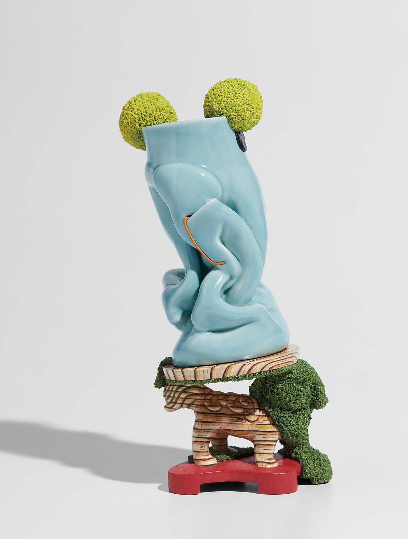 To create Overgrown, Butterly began with a cylinder of wet clay, which she folded, poked, collapsed, and twisted until a semblance of bodily presence was achieved. Next, she introduced a sculpted plinth and feet as well as other ornamental appendages. A bulbous aquamarine-coloured body is topped with two leafy bushes whilst an orange line seductively curls from an opening on the object’s side. All of this appears to precariously teeter above a small table whose surface is glazed to resemble a cartoonish woodgrain. Plush vegetation grows from underneath the table top, as if pushing the alien thing above it off kilter – perhaps a visual joke evoking the piece’s title. As is characteristic of Butterly’s work, Overgrown uses vague references that float somewhere between abstraction and reified form to create enigmatic associations, like a sculptural liaison between Eileen Agar’s hat and a Chinese scholar’s rock (a Gongshi).