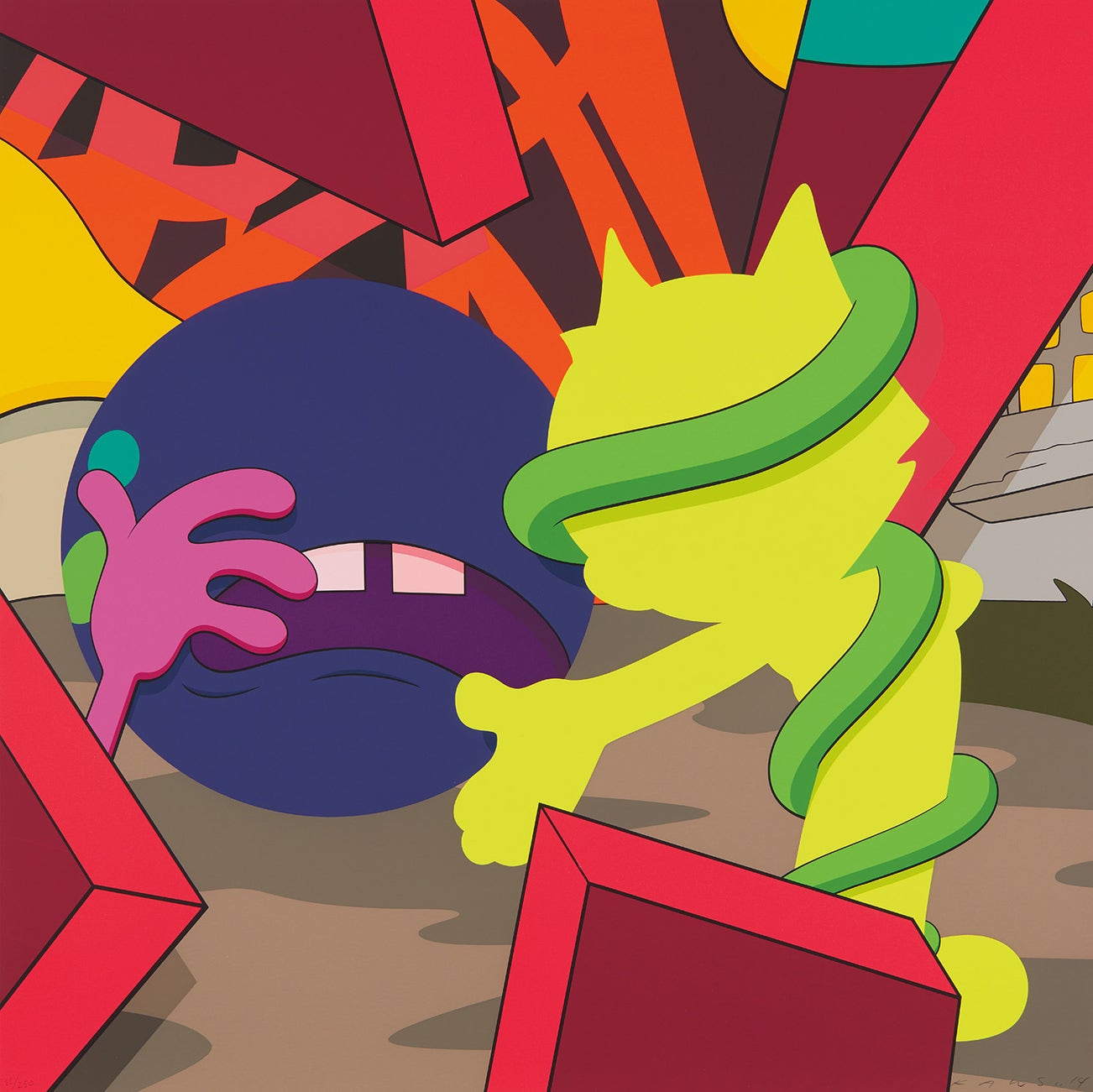 Perhaps he is most known for his larger-than-life fiberglass sculptures that supplant the body of Mickey Mouse onto KAWS' own imagined creatures, often with 'x'-ed out eyes or ultra-animated features. However, KAWS also works frequently in neon and vivid paint, adding animation and depth to contemporary paintings filled with approachable imagination. There is mass appeal to KAWS, who exhibits globally and most frequently in Asia, Europe and the United States.