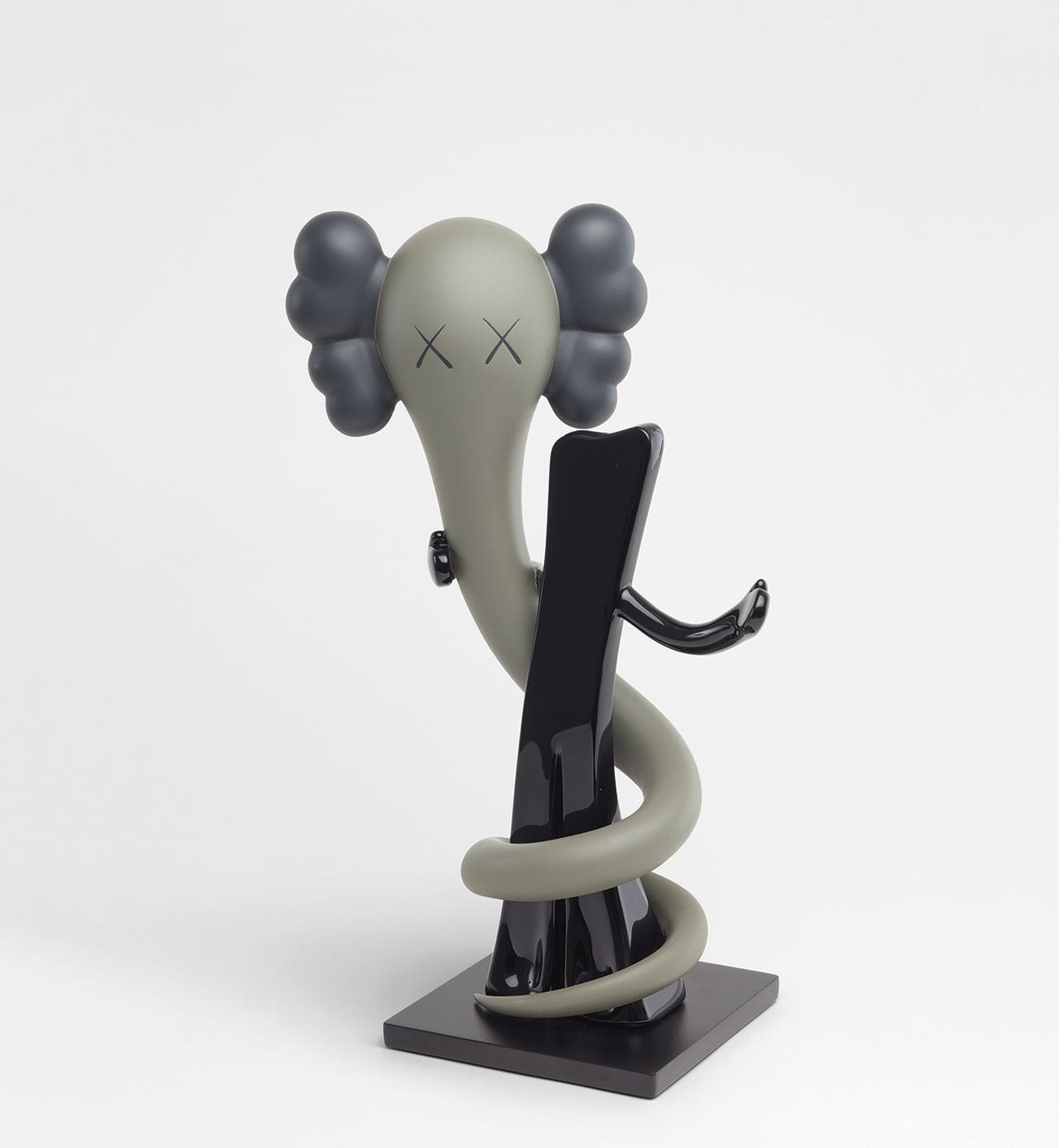 Rendered in a sophisticated grey-scale palette, BORN TO BEND features the artist’s beloved and iconic “BENDY” character with its signature X eyes, the protruding crossbones as ears and squiggly tail wrapped around a stark silhouette of the quintessential American childhood icon “Gumby”. BORN TO BEND perfectly demonstrates how KAWS re-contextualises the role of mass culture in art, based as it is on the BENDY character that initially took the form of small-scale figurines starting in 2003. What began as toy versions radically expanded in the past decade to become different sized works of sculpture, deliberately aimed at dismantling the distinctions between high and low art. As KAWS explained, speaking of his strategy of blurring the lines between toys and sculptures, “to me they involve the same thought process, so it’s funny that when I work in big bronze, it’s called a sculpture, but something I do that’s small and plastic is called a toy” (KAWS, quoted in Carlo McCormick, “From the Streets to TV to Fine Art Galleries, KAWS Is Everywhere”, Paper, 4 November 2013, online.) One of the artist’s most recognisable figures, another version of BORN TO BEND was a key highlight that adorned the main entrance of the historic landmark building of the Pennsylvania Academy of the Fine Arts (PAFA) in 2013 and was shown at the artist’s first UK solo exhibition at Yorkshire Sculpture Park in 2016, as well as KAWS: WHERE THE END STARTS at the Modern Art Museum of Fort Worth the same year. Expressing the unique duality that encapsulates the allure of KAWS’s work, BORN TO BEND stimulates a sense of nostalgia and delight.