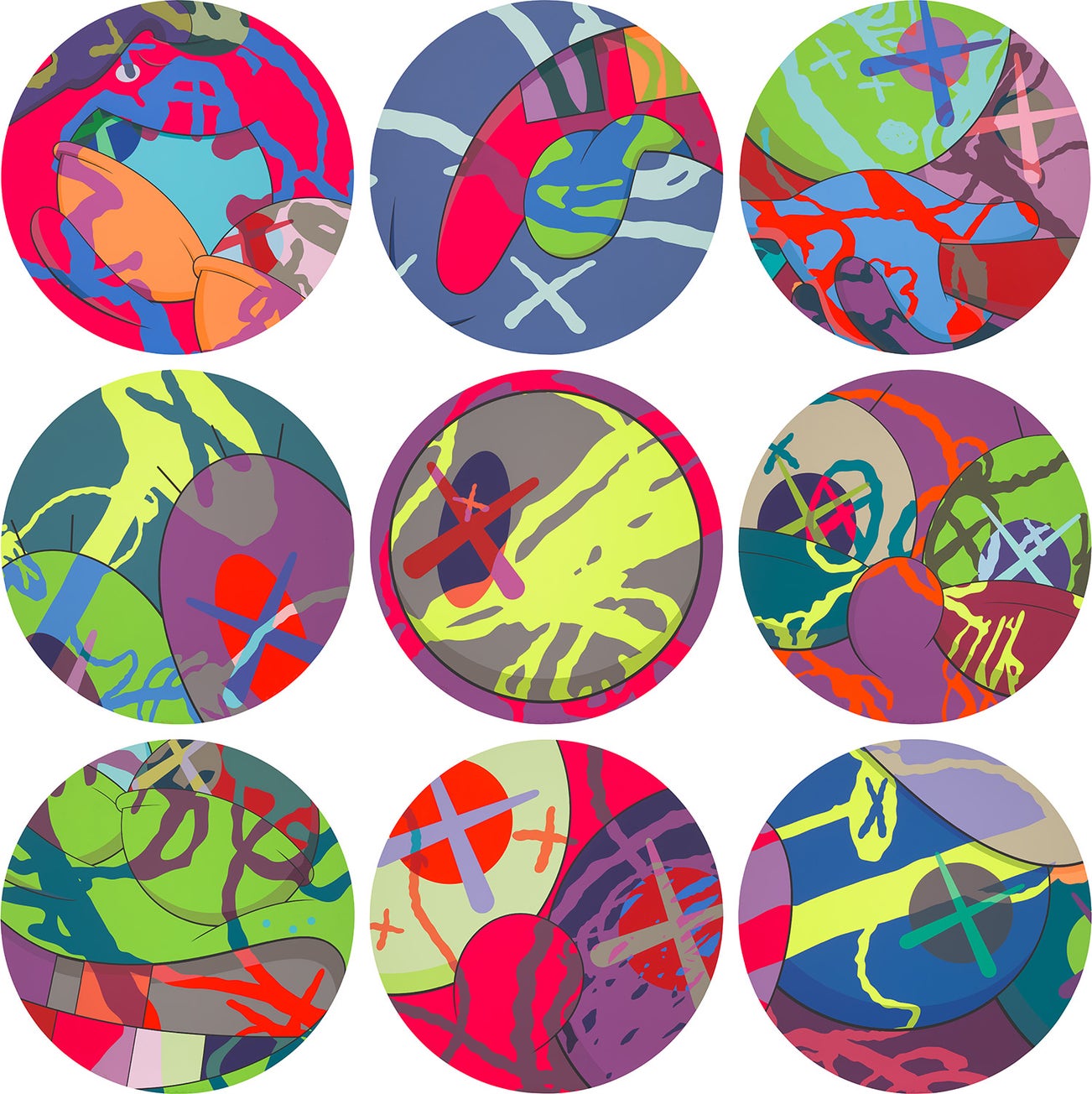 Perhaps he is most known for his larger-than-life fiberglass sculptures that supplant the body of Mickey Mouse onto KAWS' own imagined creatures, often with 'x'-ed out eyes or ultra-animated features. However, KAWS also works frequently in neon and vivid paint, adding animation and depth to contemporary paintings filled with approachable imagination. There is mass appeal to KAWS, who exhibits globally and most frequently in Asia, Europe and the United States.