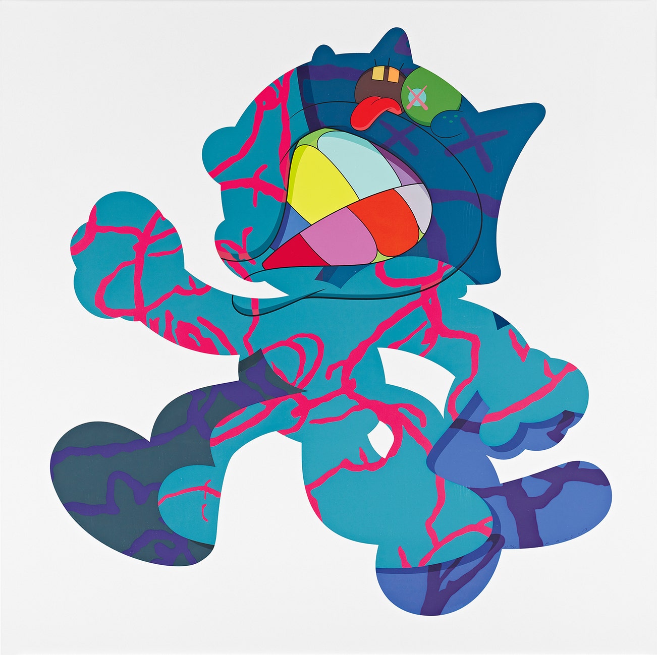 Perhaps he is most known for his larger-than-life fiberglass sculptures that supplant the body of Mickey Mouse onto KAWS' own imagined creatures, often with 'x'-ed out eyes or ultra-animated features. However, KAWS also works frequently in neon and vivid paint, adding animation and depth to contemporary paintings filled with approachable imagination. There is mass appeal to KAWS, who exhibits globally and most frequently in Asia, Europe and the United States.