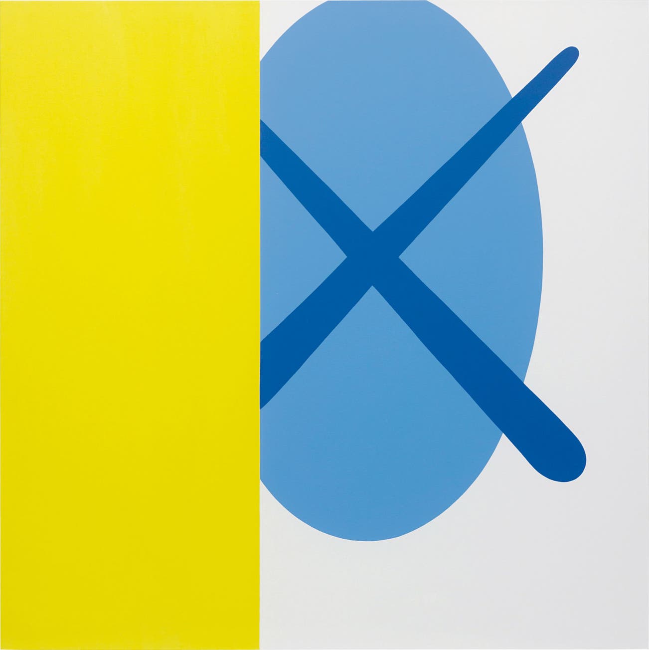 In Projector, the large X that dominates the canvas references his cartoon figures, for which he replaces their eyes with Xs. The image can therefore